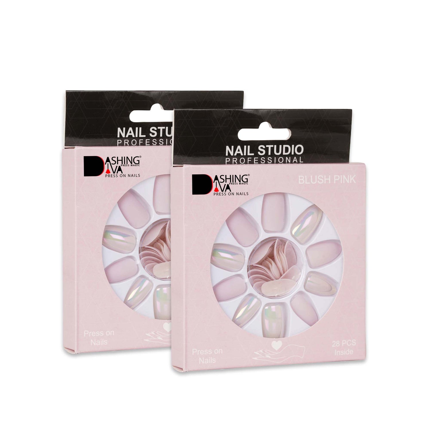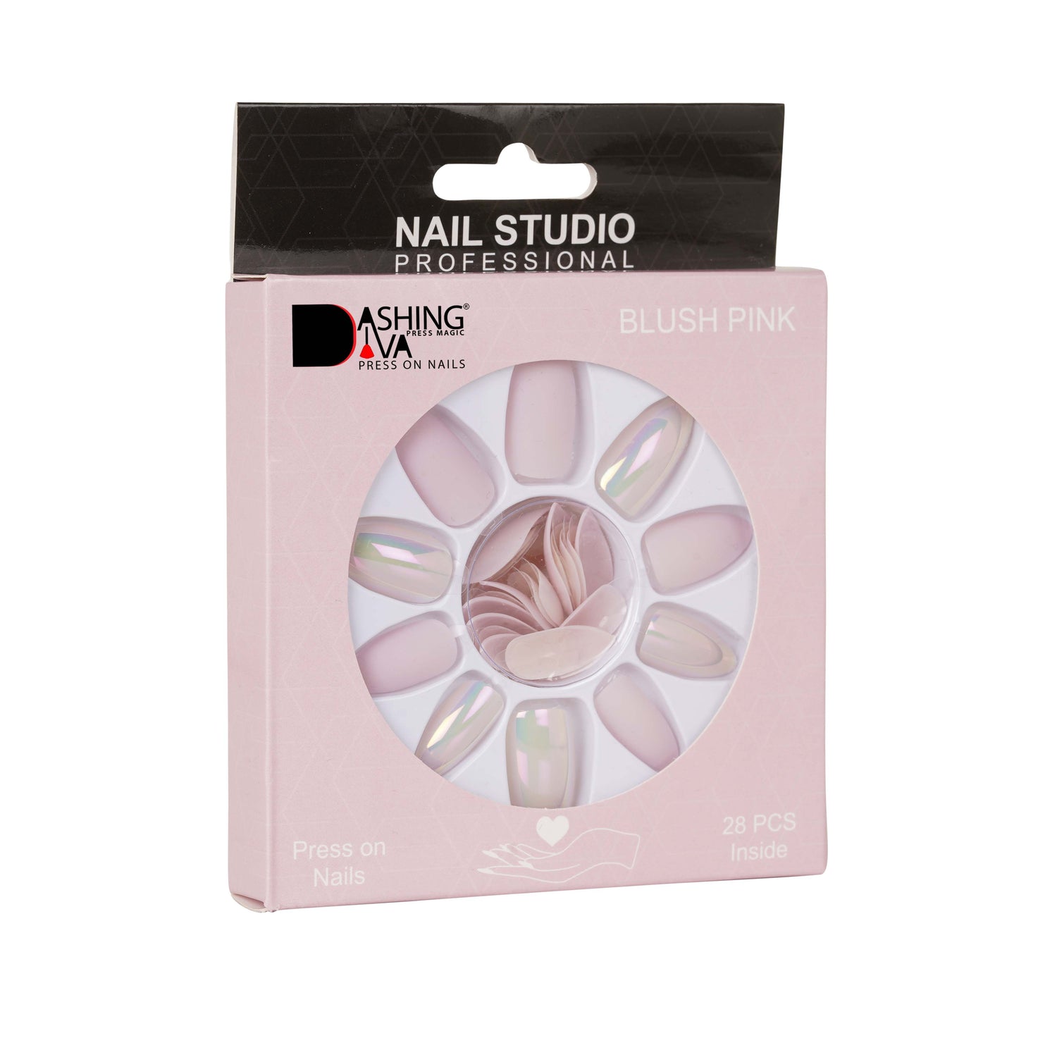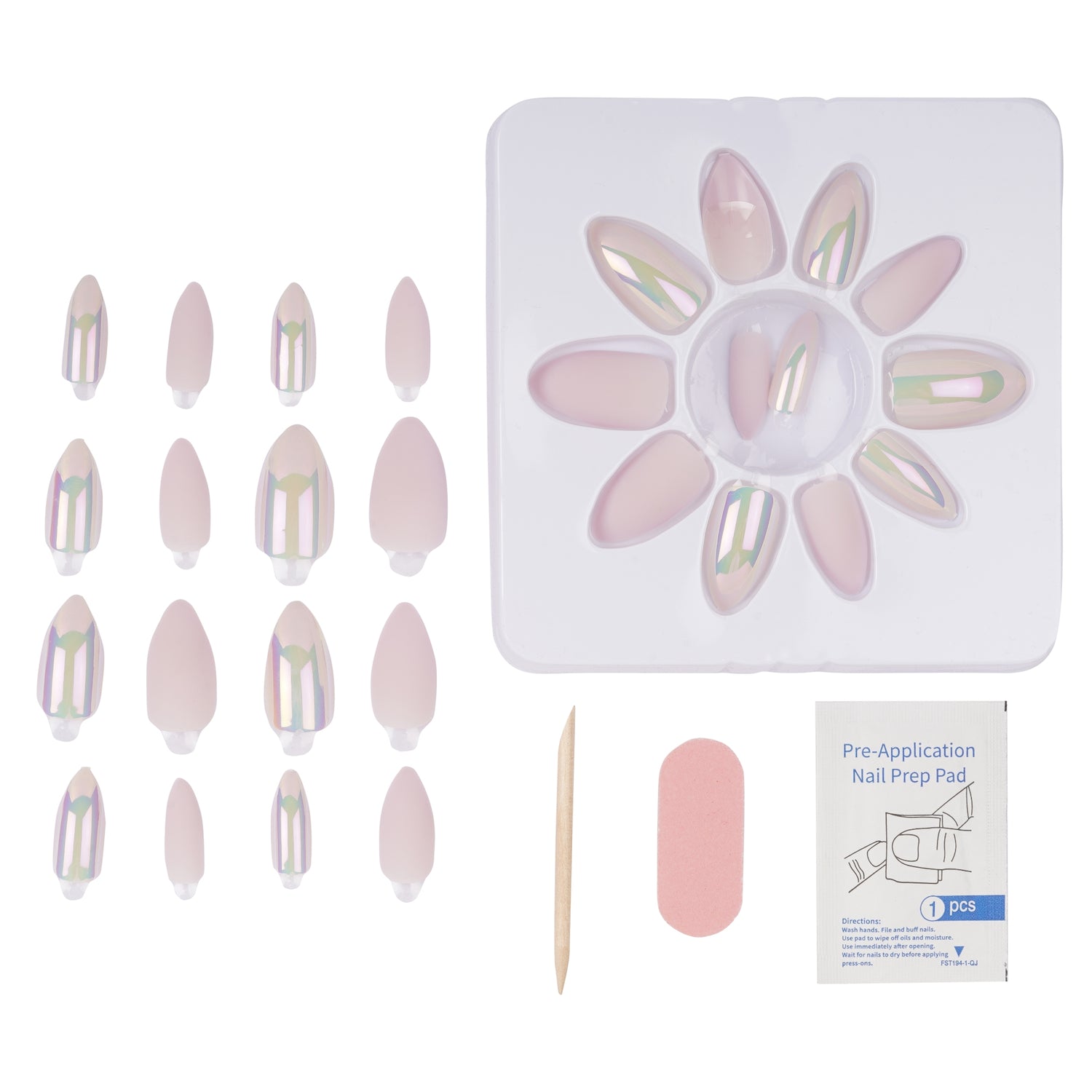Package Contains: Pack of 28 Blush Pink Press on Nails, 1 Cuticle Push, 2 Wipes, 1 Buffer & 1 Quick Dry Glue