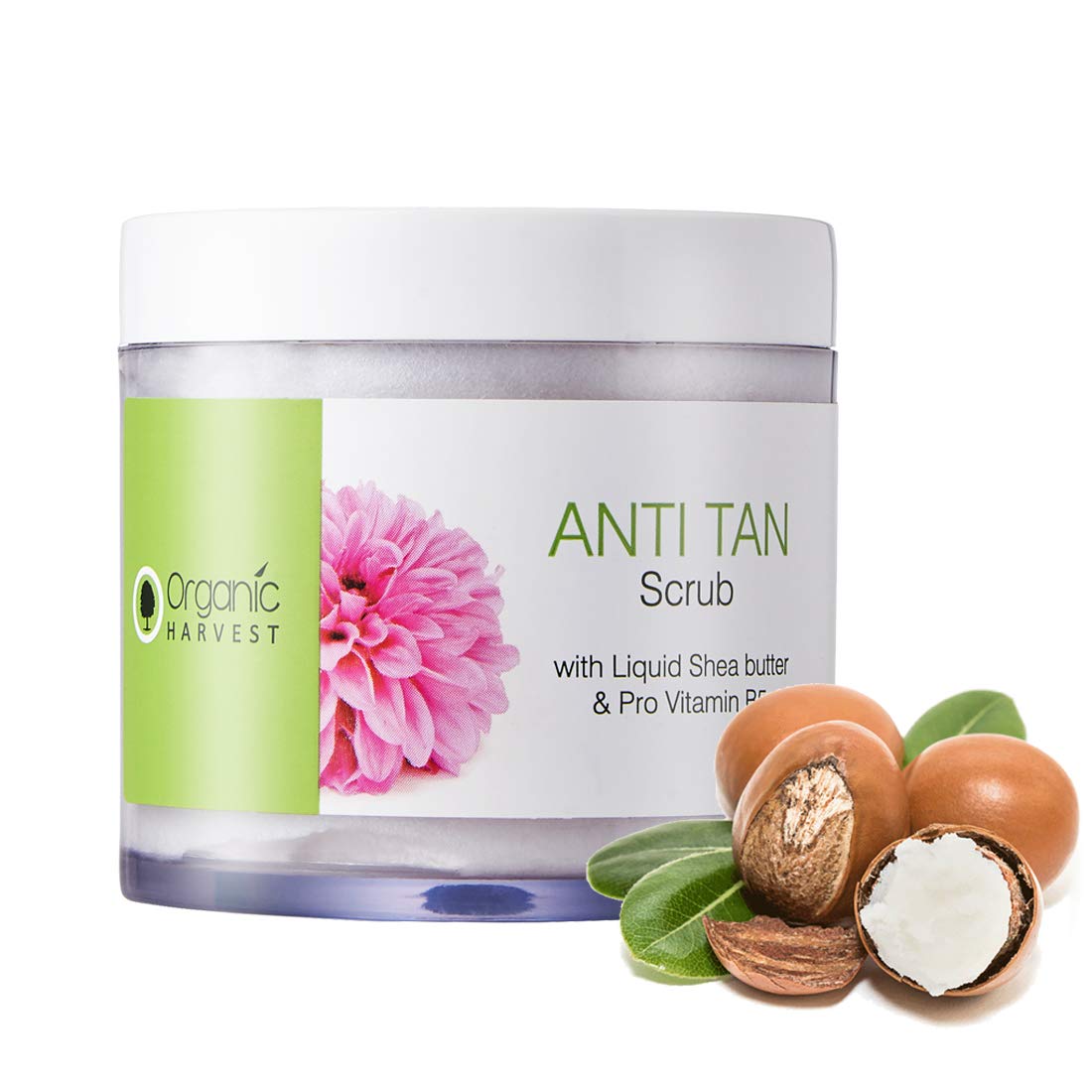 Organic Harvest Anti-Tan Scrub gently exfoliates your skin, unclogs pores, and removes tanning. It contains scrubbing beads and olive oil in a cream base that will help in repairing sun damage. The scrub combines the benefits of olive oil and liquid Shea butter which deeply moisturizes the skin, thanks to Pro-Vitamin B5 which improves skin hydration levels of the skin. The scrub gently eliminates dead skin cells and refines the texture of the skin.