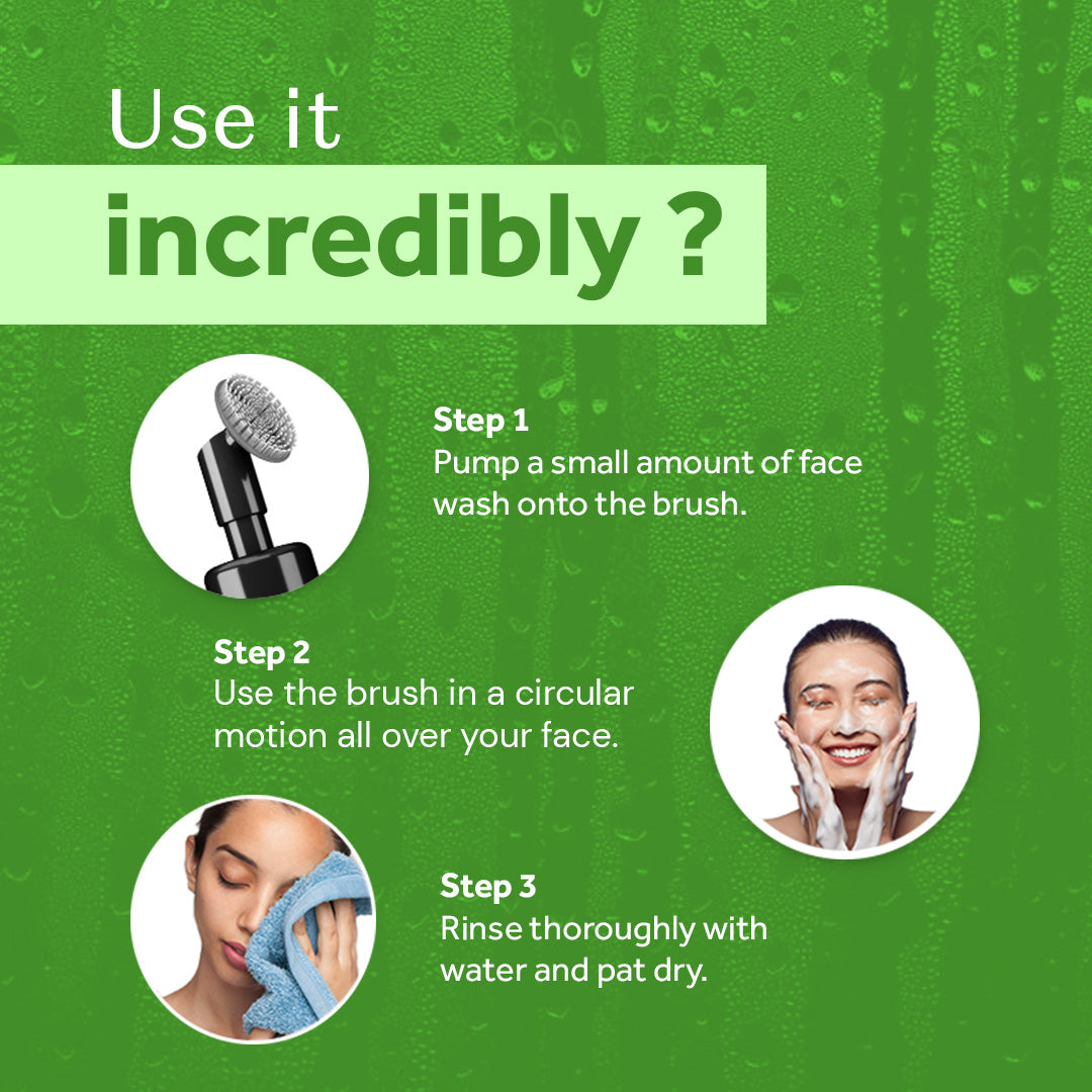 - Use the built-in face brush to apply a small amount of face wash all over your face and neck.