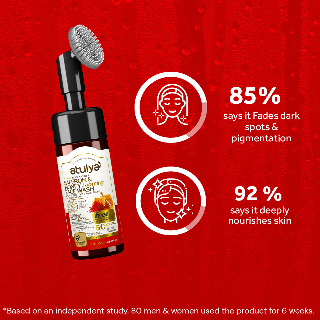 Atulya Saffron & Honey Foaming Face Wash gently brightens and nourishes the skin while cleansing deeply. The built-in silicone brush helps exfoliate and remove dirt, oil, and dullness. Saffron helps even out skin tone, while honey locks in moisture and leaves skin feeling soft and smooth. The rich foam rinses clean without residue or dryness. Ideal for normal to dry skin. Free from sulfates, parabens, and synthetic fragrance, it blends traditional care with modern convenience.