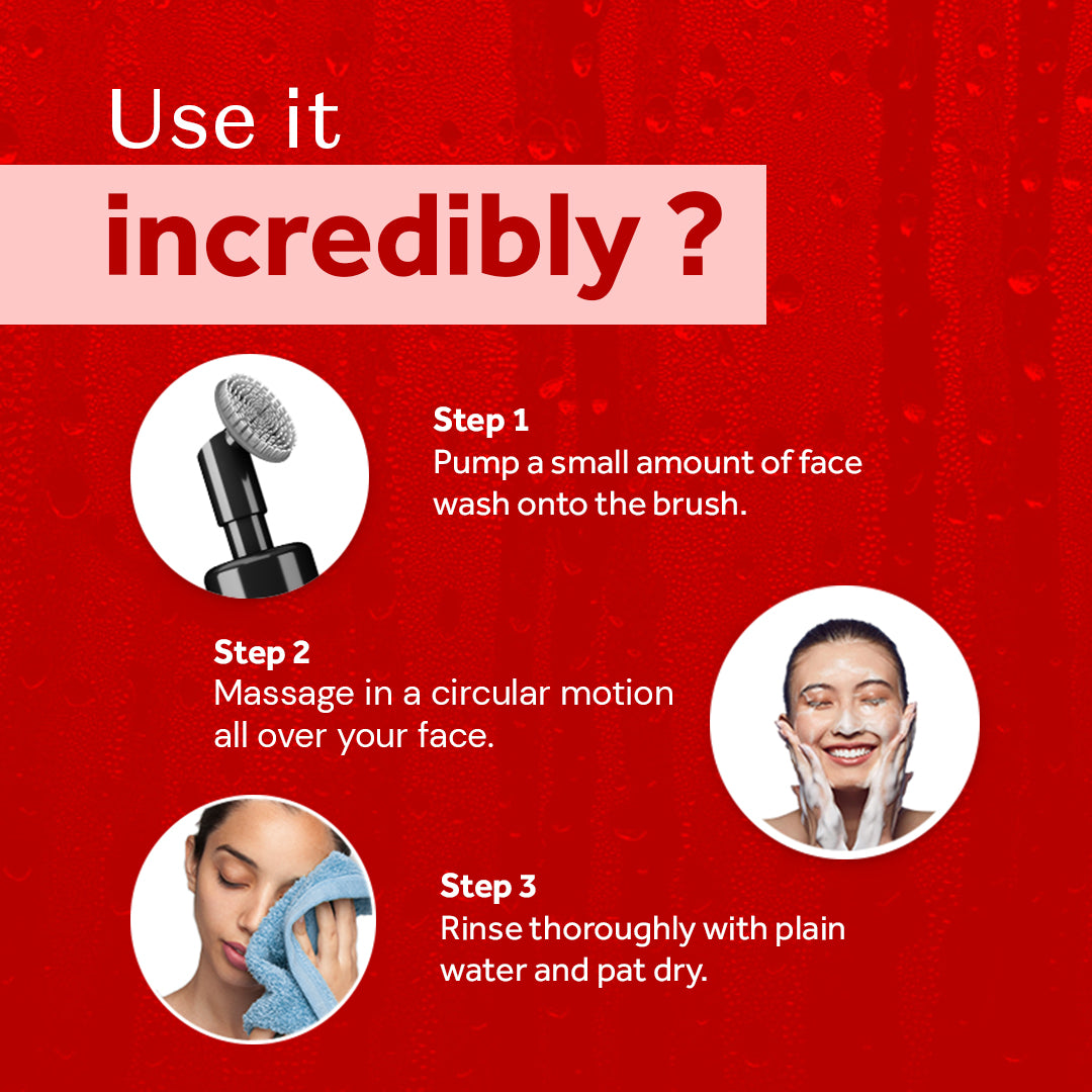 - Use the built-in face brush to apply a small amount of face wash all over your face and neck.