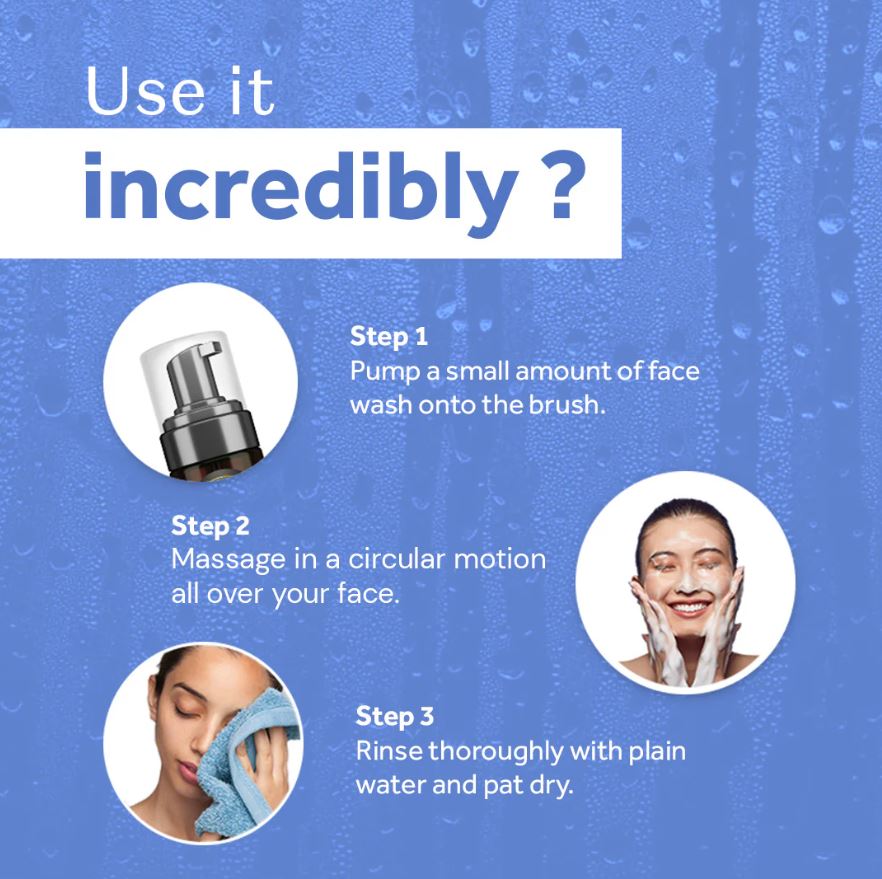 - Use the built-in face brush to apply a small amount of face wash all over your face and neck.