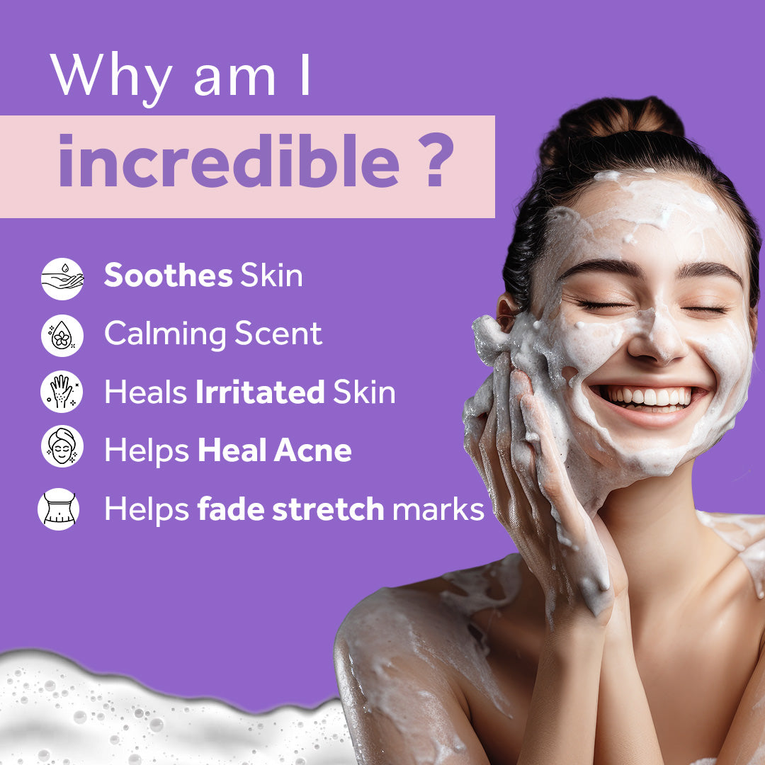 - Lavender calms irritation, reduces redness, and soothes sensitive skin while maintaining softness and hydration.
