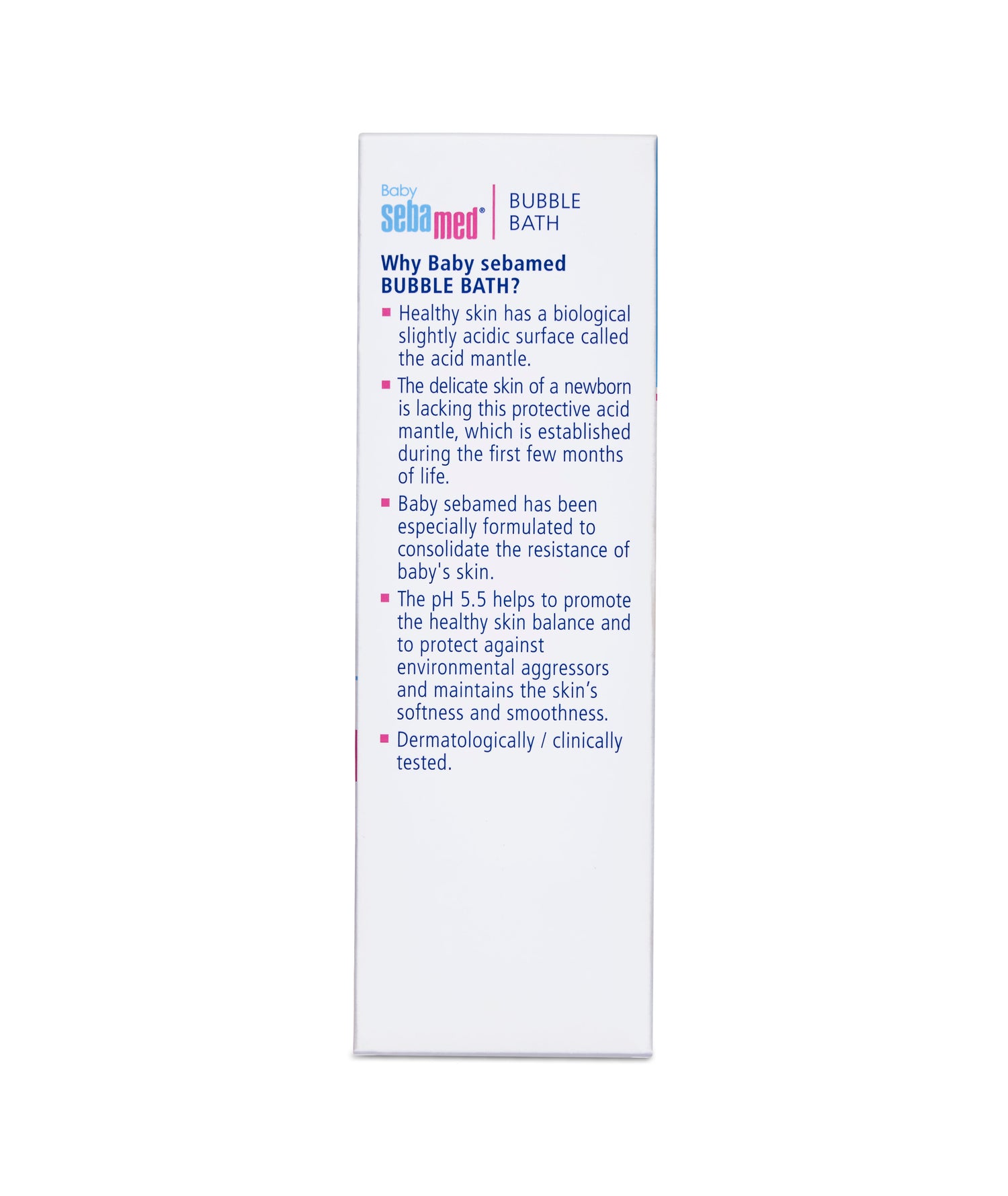 Sebamed baby bubble bath has pH of 5.5 and has extra mild sugar based cleanser. Baby Bubble Bath is an extremely mild foaming bath additive with good cleansing properties. It strengthens the resistance of baby skin with the physiological pH of 5.5. At pH 5.5 alone the skin barrier remains intact. It has been clinically proven that only at pH 5.5, the lipid and moisture loss is minimum and the growth of pathogenic bacteria is restricted. Conventional bubble baths have pH>7 and chemicals like formaldehyde, phthalates, SLS which leads to allergic reactions. Sebamed baby bubble bath has chamomile which soothes irritated skin and has anti bacterial properties. Due to the special combination of active ingredients, Baby Bubble Bath causes no irritation of the eyes - the dreaded tears and stinging! Made in Germany 100% soap and alkali free Extra mild tenside complex for gentle cleansing action without dehydrating Soft controlled foaming Natural moisturizing agents protect against dryness Supports the natural lipid balance Allantoin makes the skin soft and smooth Pleasant botanical fragrance Ideal from six month onwards No tears formula Clinically proven – 70% reduction in flaking & 100% increase in skin lipids within 2 weeks. * [*Source:- Adapted from Sebapharma product manual, Sebapharma, Germany]0% irritant reactions & almost 0% allergic reactions* [*Source:- Adapted from Sebapharma product manual, Sebapharma, Germany]