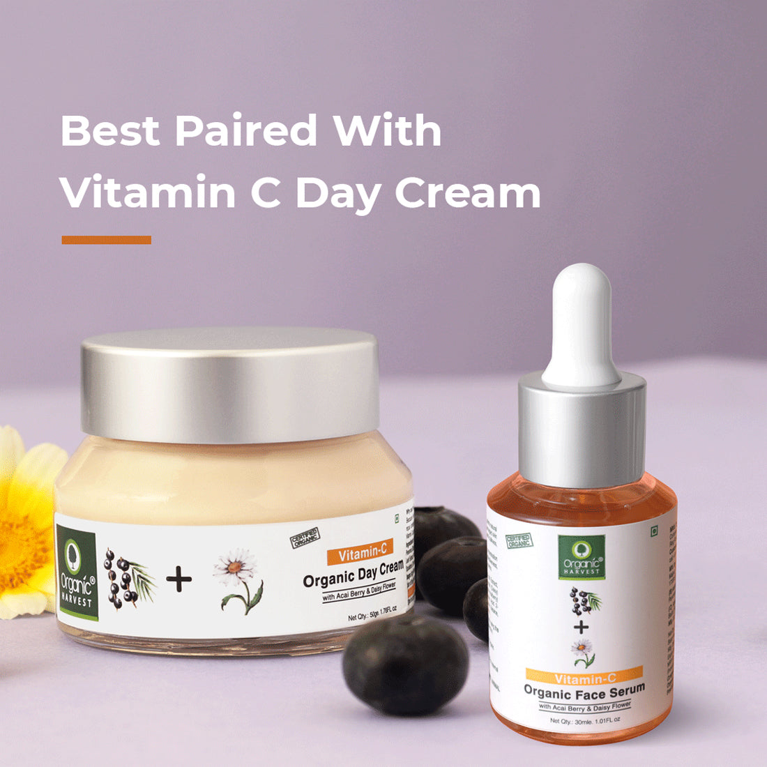- Organic Harvest Vit C Serum for Face also uses natural acai berries. Hailing from the native rainforests of South America, these berries are also potent antioxidants. Loaded with minerals and vitamins, it helps the vitamin C serum make the skin look radiant, blemish-free, and even-toned.