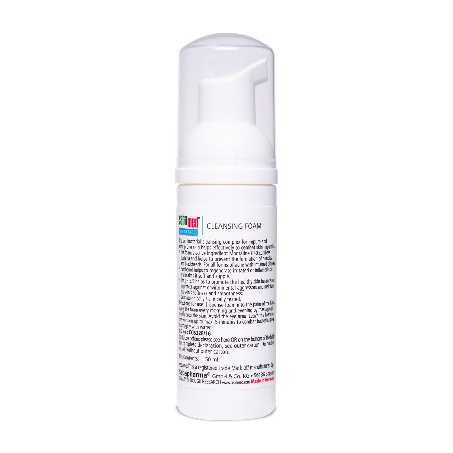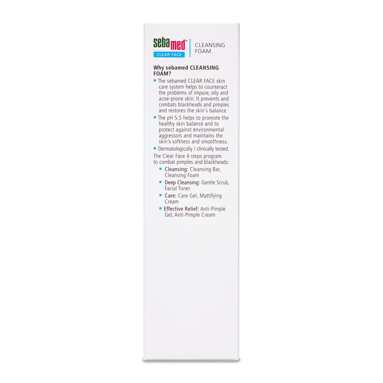 Sebamed Clear Face Cleansing Foam fights pimples and supports healthy facial skin. Great as a daily cleanser as it is ultra-hydrating without draining your skin of moisture. The refreshing foam gently removes oil while the special formula fights pimple-causing bacteria without making your face red or shiny. Sebamed Clear Face Cleansing Foam ensures the gentle and effective deep cleansing of the pores to combat pimples, blackheads and skin impurities. Sebamed Clear Face Cleansing Foam contains mild soap and alkali free wash active substance removes excessive sebum, desquamation and dirt particles without drying the skin. The new antibacterial active ingredient Montaline C40 combats bacteria - reduces bacteria count from 1 lac to 0 in 5 minutes and helps to prevent the formation of new pimples. Vitamin B5 supports the natural regeneration of irritated skin. Sebamed Clear Face Cleansing Foam is adjusted to the skin's natural pH value of 5.5, protecting and supporting the biological barrier function of the skin's acid mantle to help prevent new pimples from forming. Give your oily skin a feeling of freshness without drying it and help your acne to heal with our Clear Face Cleansing Foam. At pH 5.5, the growth of acne causeing bacteria is also minimum Effectively reduces pimples acne Mild pore-deep cleansing removes excess sebum Combats the proliferation of acne causing bacteria with the pH value of 5.5 Refines the complexion, provides a matt finish and prevents shine. Soothes with Panthenol and encourages the regeneration of irritated and inflamed skin. Clear Face range is non comedogenic & non allergenic Free from harsh soaps / Oil / colorant / irritants like Parabens / Paraffin / Propylene Glycol / Phthalates – hence is safe also for acne prone very sensitive skin