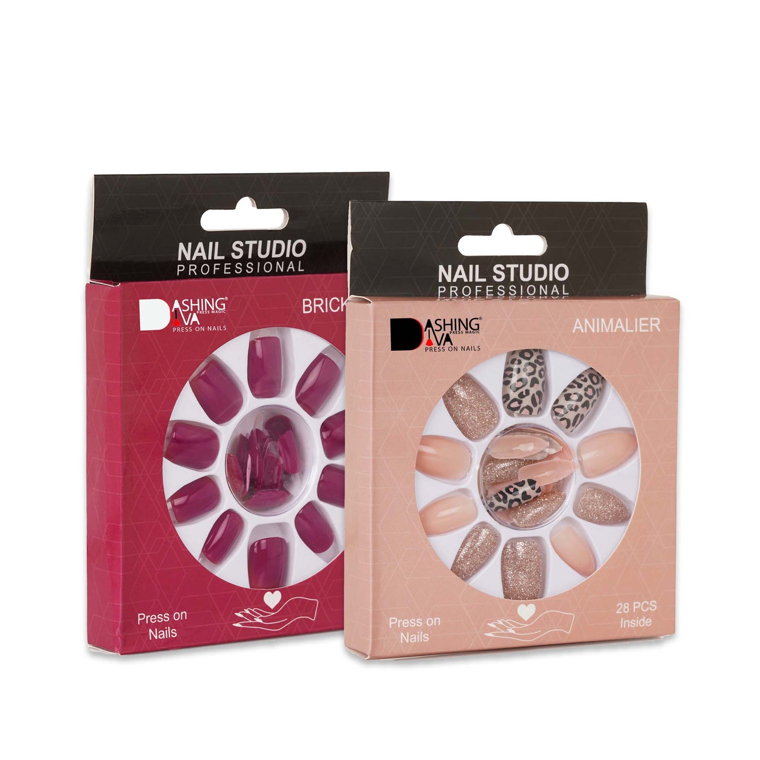 - Combo 1: Pack of 28 Nails, Including 15 Pink Nude, 4 Animal Prints, 2 Beige, and 5 Glitter Press on Nails, 1 Cuticle Push, 2 Wipes, 1 Buffer & 1 Quick Dry Glue