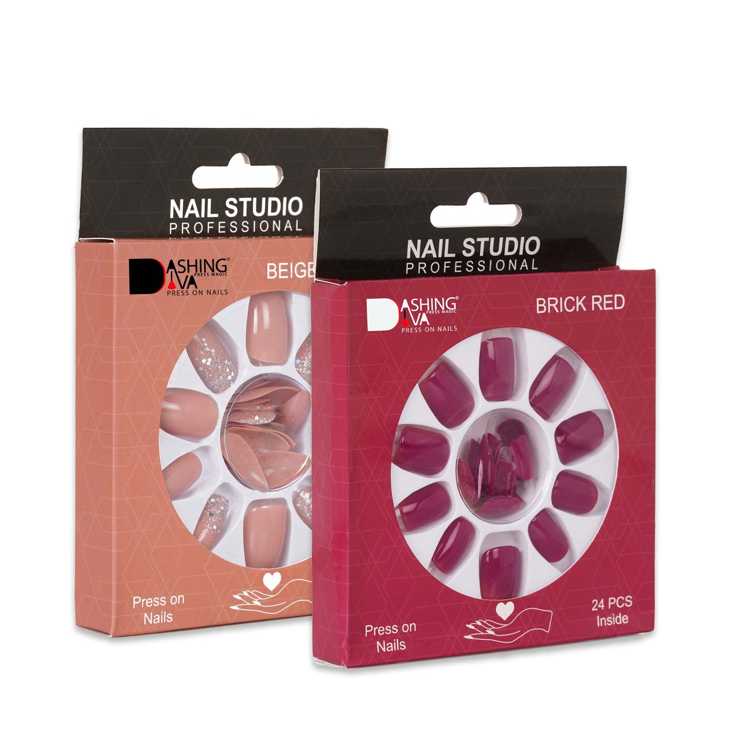 Stick On Nails | Dashing Diva Press Magic Beige Sparkles, Brick Red Reusable Artificial Fake Acrylic Press on Nails With Quick Dry Nail Glue, Pack of 2