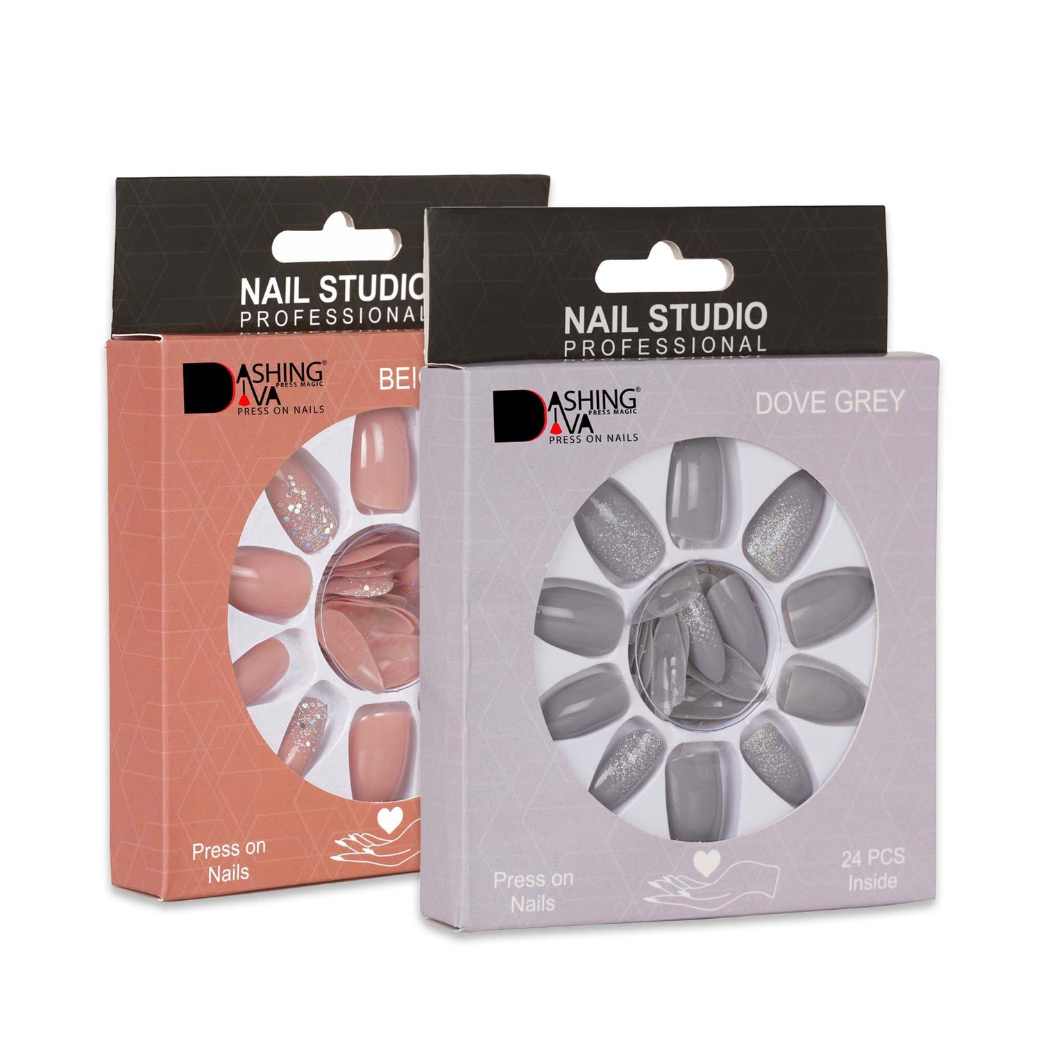 Stick On Nails | Dashing Diva Press Magic Beige Sparkles, Dove Grey Artificial Reusable False Acrylic Press on Nails With Quick Dry Nail Glue, Pack of 2