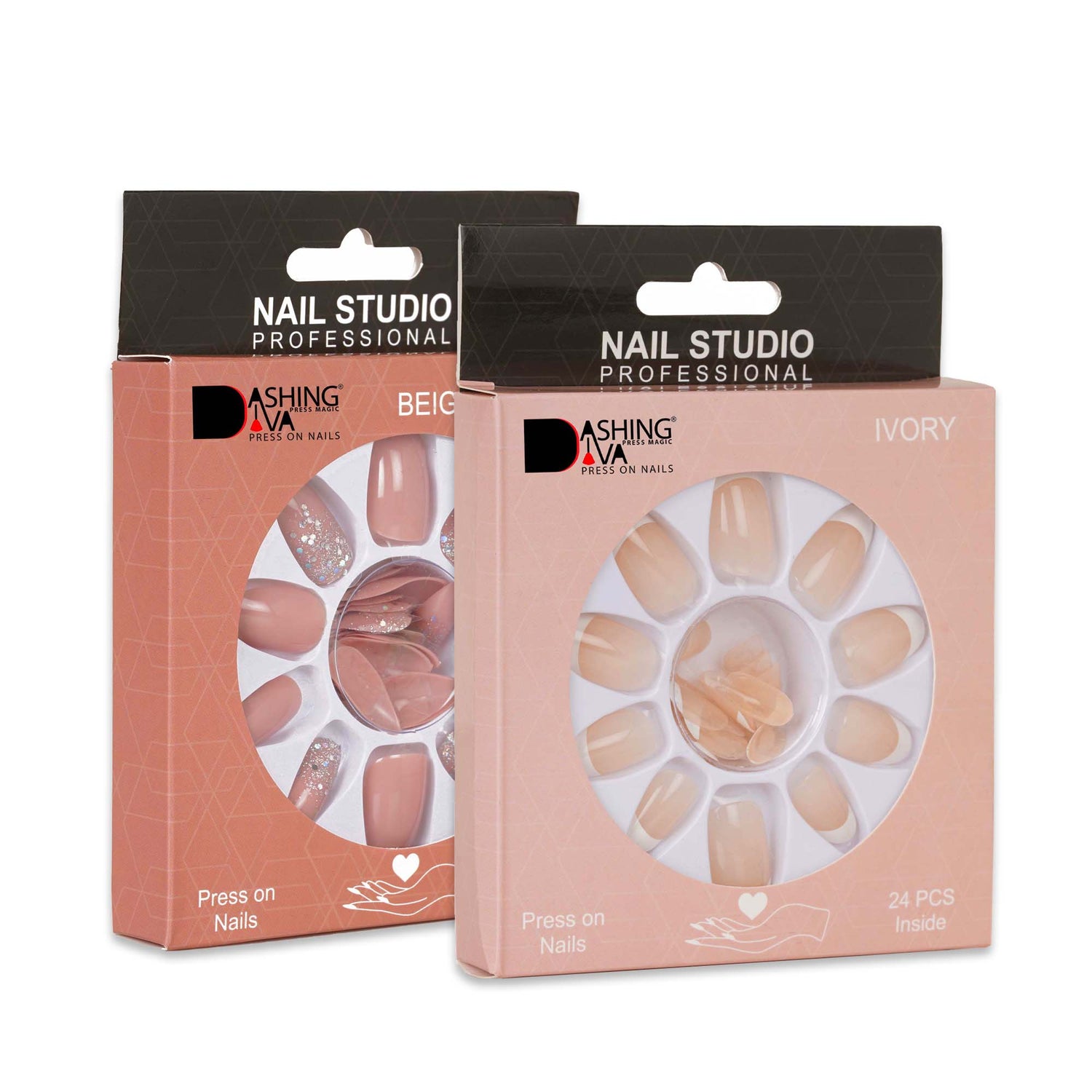 - Combo 2: Pack of 24 Ivory Press on Nails, 1 Cuticle Push, 2 Wipes, 1 Buffer & 1 Quick Dry Glue