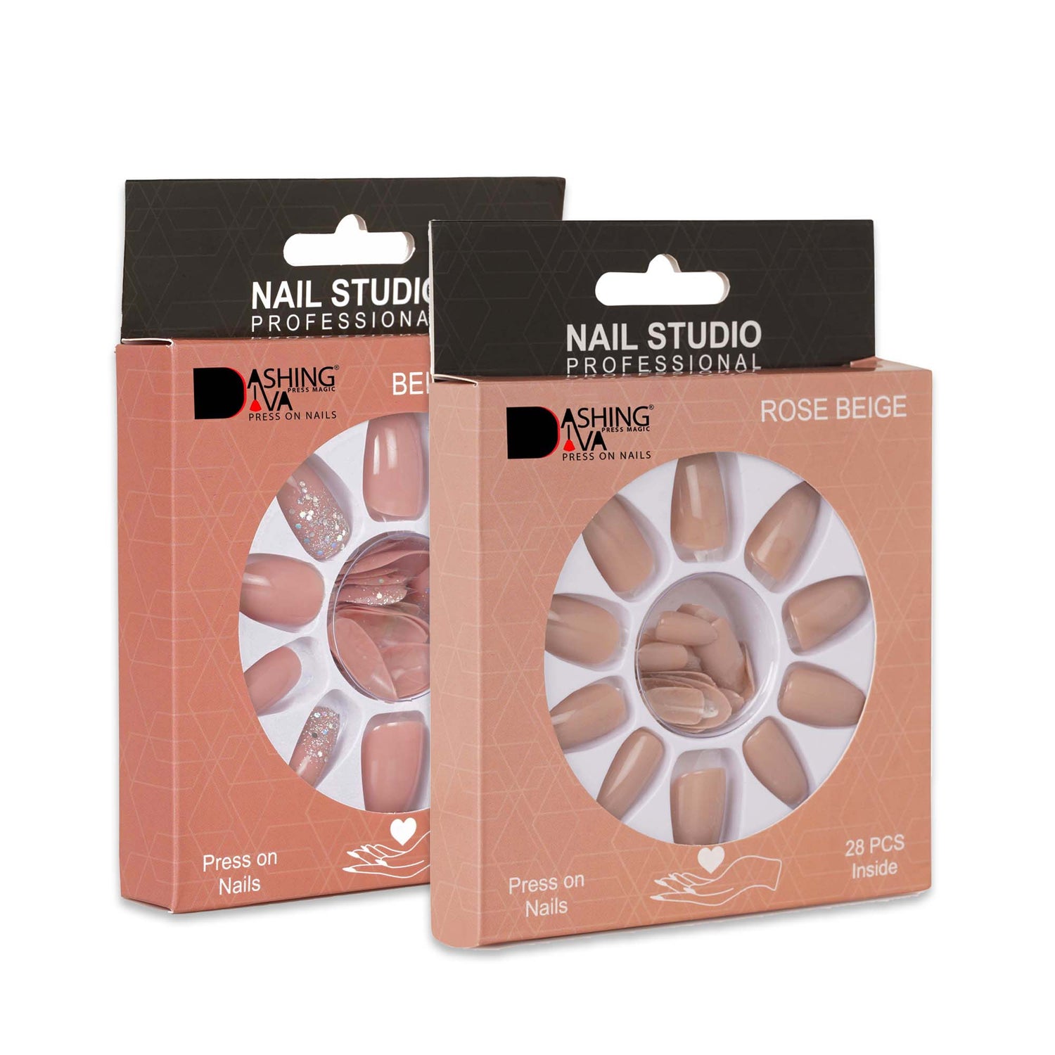 Stick On Nails | Dashing Diva Press Magic Beige Sparkles, Rose Beige Reusable False/Fake Acrylic Press on Nails With Quick Dry Nail Glue, Pack of 2