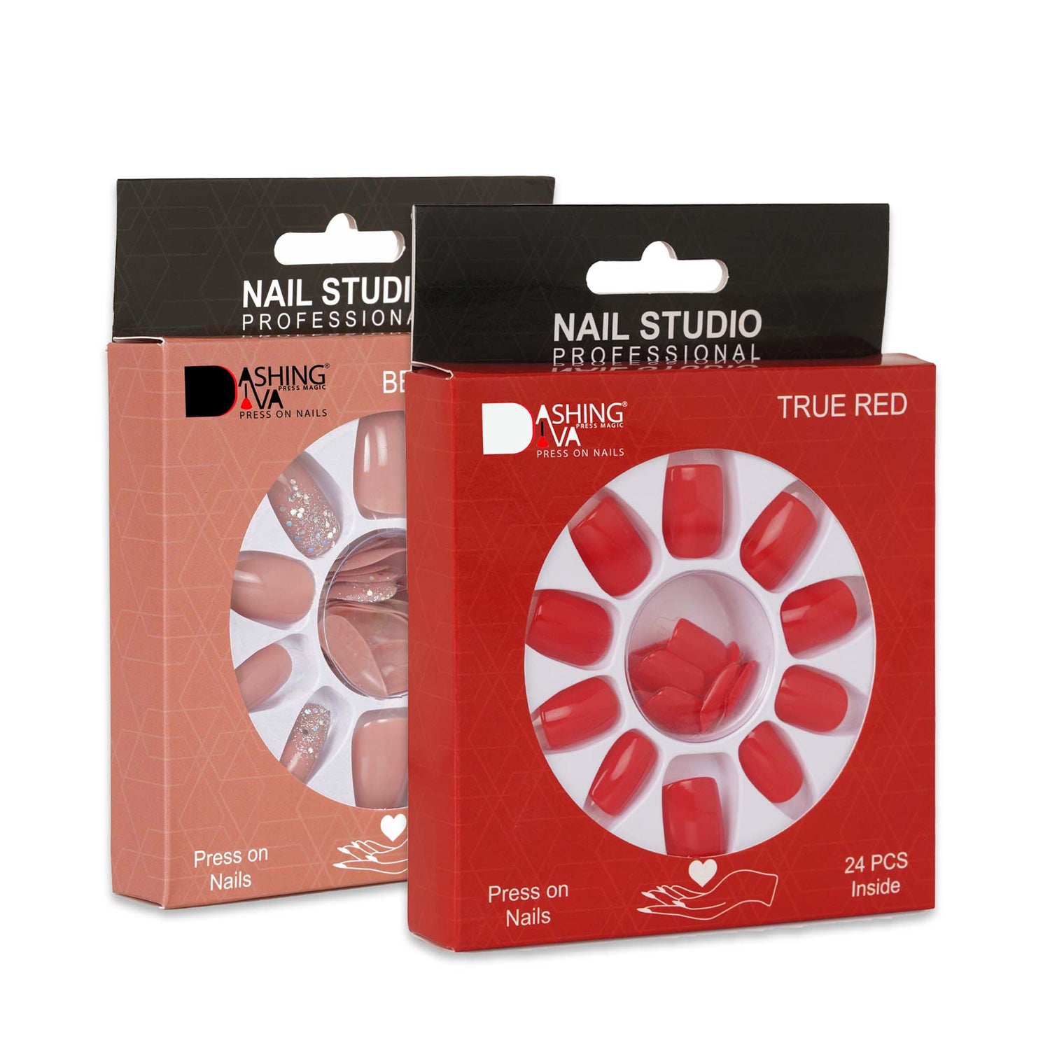 Stick On Nails | Dashing Diva Press Magic Beige Sparkles, True Red Nail Art Nail Extension Acrylic Press on Nails With Quick Dry Nail Glue, Pack of 2