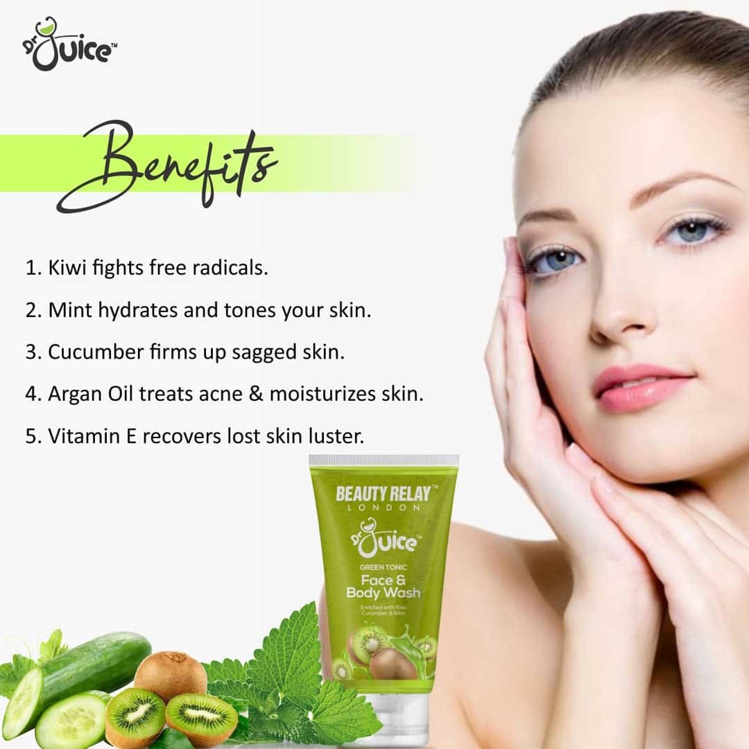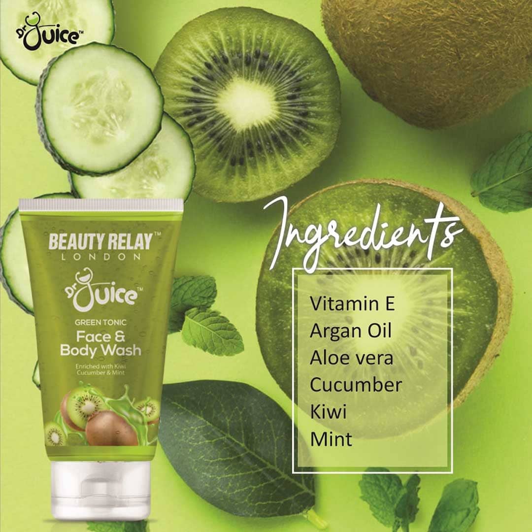 - Dr. Juice Green Tonic Face and Body Wash effectively benefit in cleaning off oil and debris and removing makeup, dirt, dead cells, and other environmental pollutants.