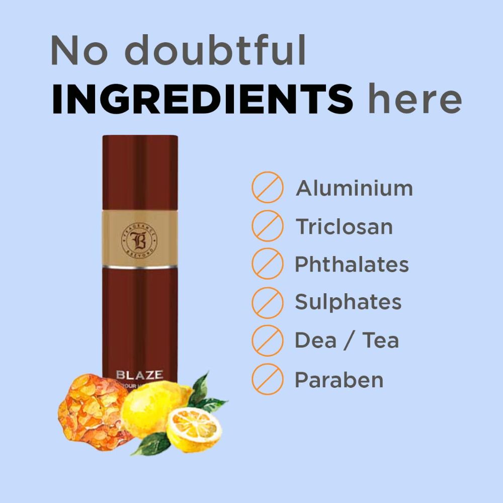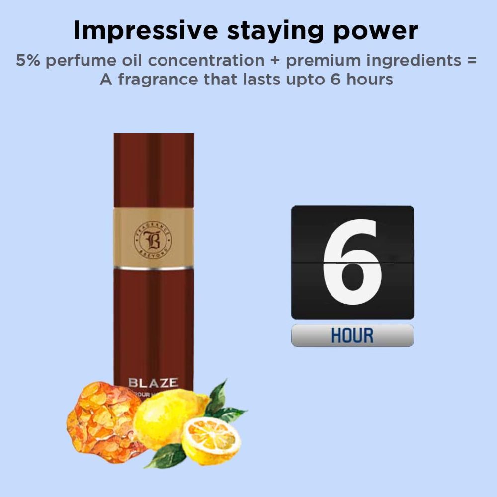 Let the abundance of your enigmatic persona float with the bold fragrance of blaze. The top notes consist of lemon, and basil aromatic. The middle note combines coriander and cardamom into base notes of amber and patchouli.
