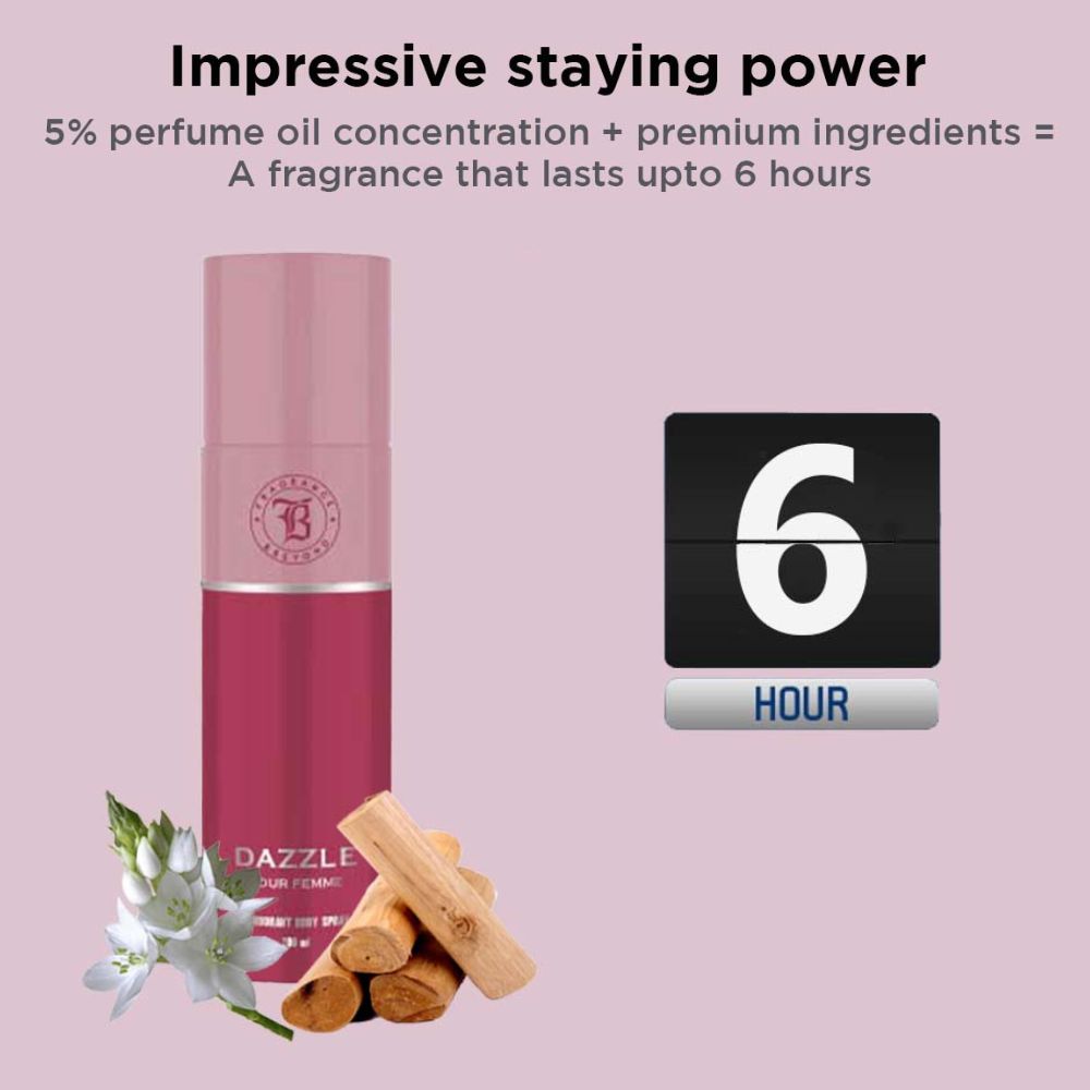 Dazzle is a strong, creamy white floral fragrance capturing the spirit of contemporary, diverse, and authentic women. The perfume is a perfect blend of Indian tuberoses, absolute Jasmine, and sandalwood.