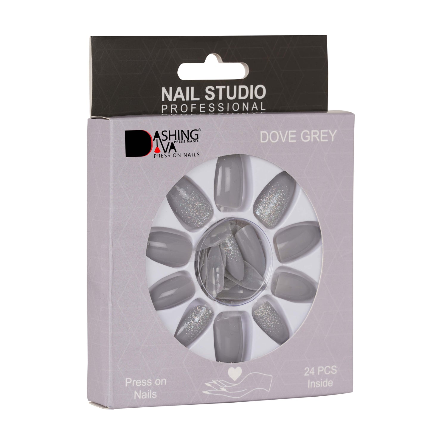 Package Contains: Pack of 24 Dove Grey Press on Nails, 1 Cuticle Push, 2 Wipes, 1 Buffer & 1 Quick Dry Glue