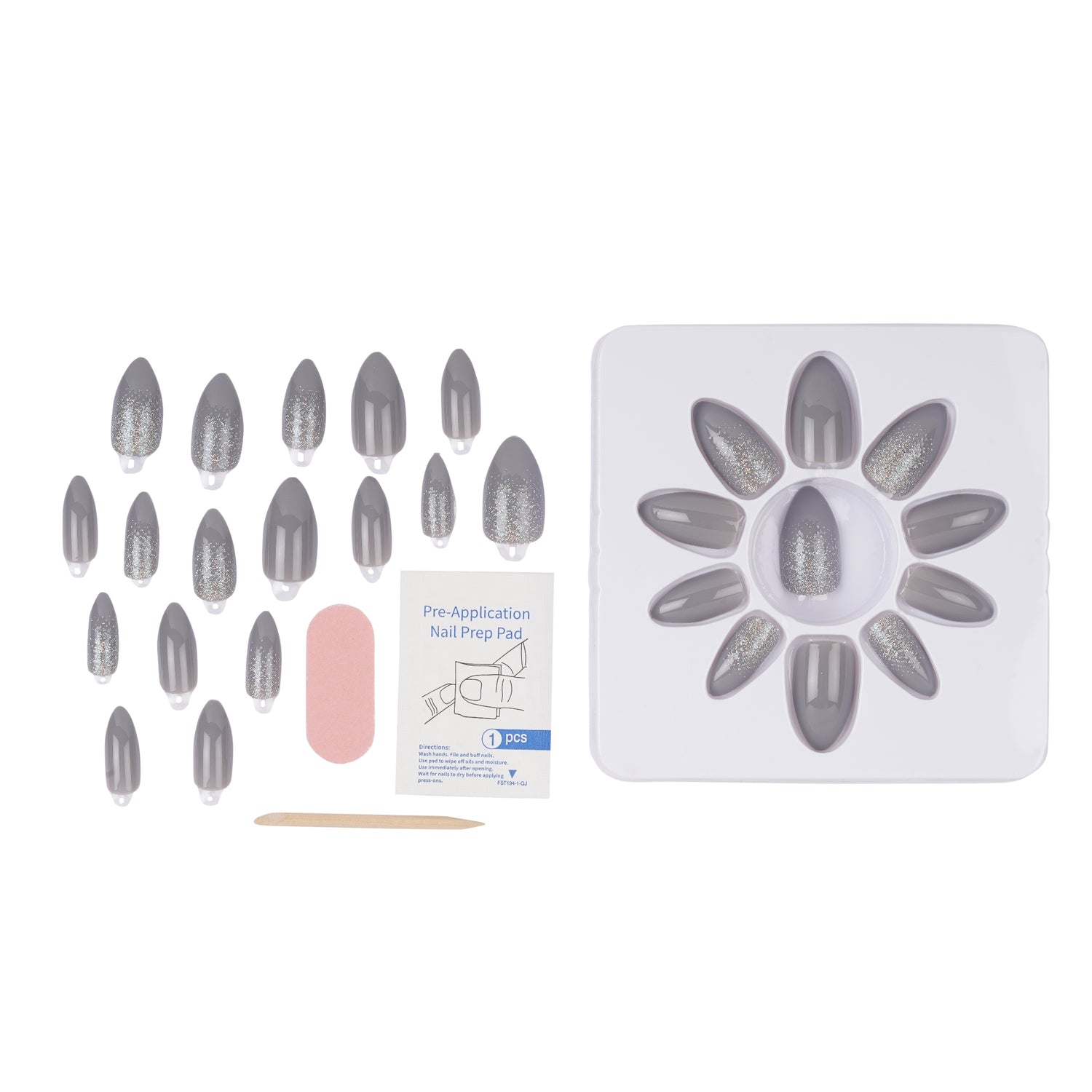 Dove's gray color symbolizes purity, nobility, and perfection and that is why it is often used for important and festive events. It is quite natural that this type of manicure is gaining more and more popularity because it looks refined and elegant. This set of press-on nails comes with 24 pcs of dove gray along with some soft glitter which makes the hands of a woman look very gentle and feminine and this is the best base for any outfit you are planning to wear.