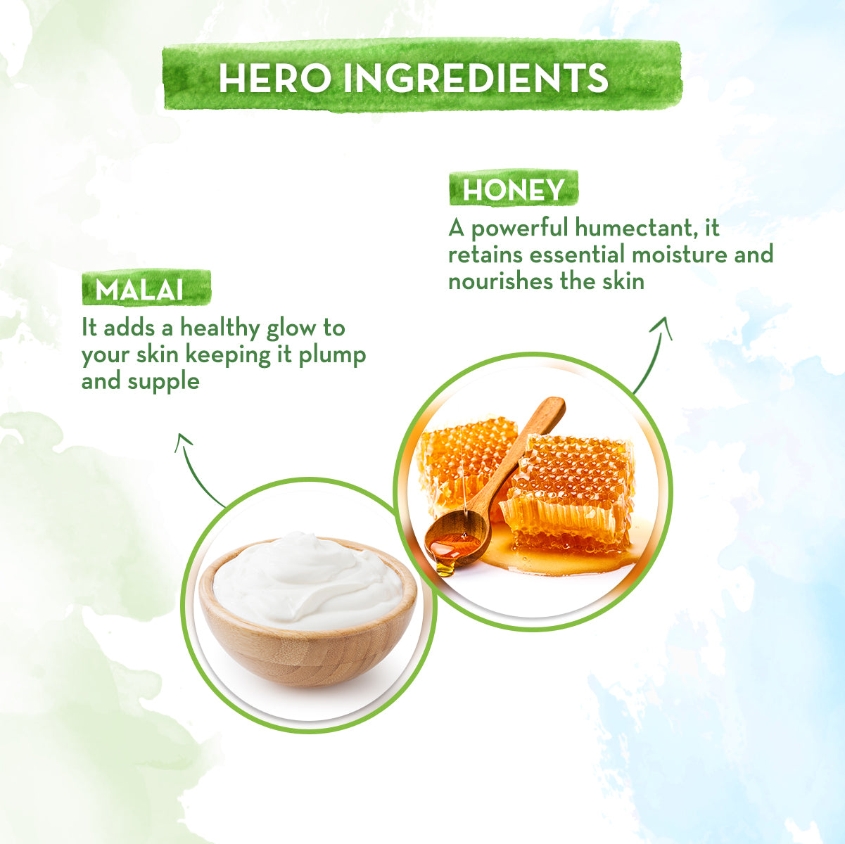 - Rinse off, pat dry, and follow up with Honey Malai Body Lotion.