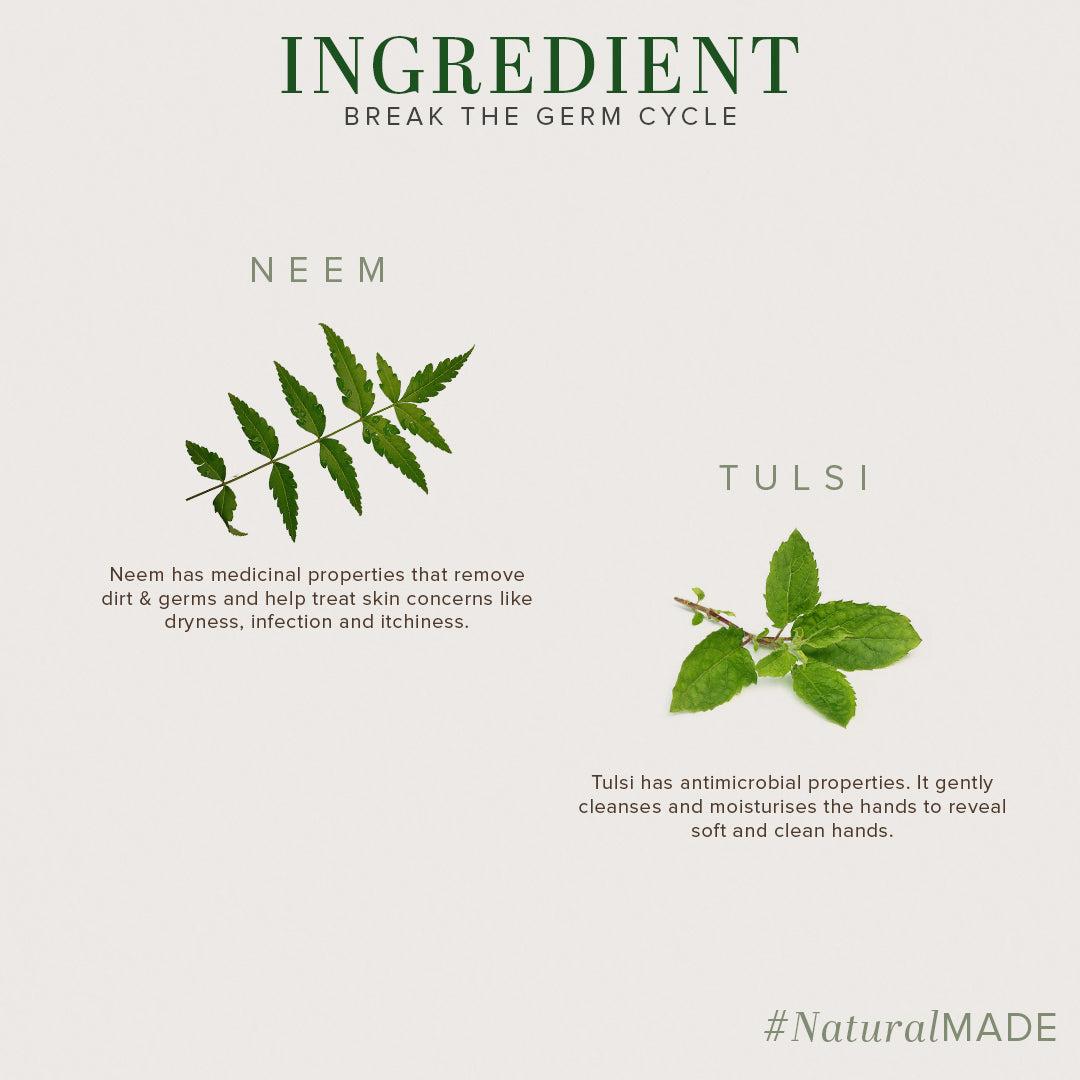 - Neem and Tulsi work together to protect the skin, reduce irritation, prevent dryness from frequent washing, and leave the hands refreshed, clean, and naturally purified with a mild herbal fragrance that feels soothing and hygienic every time.