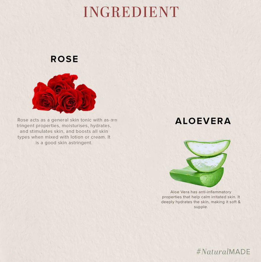 Ingredients: Kaolin, Rose petals ext (Rosa Centifolia), Calamine powder, Sandalwood powder (Santalum album), Aloevera ext (Aloe Barbadensis), Suhaga (Calcined Borax), Chirongi ( Buchanania lanzan), Basil ext (Ocimum Basilicum), Collagen powder (Hydrolyzed collagen), Daruhaldi (Berberis Aristata), Base Q.S