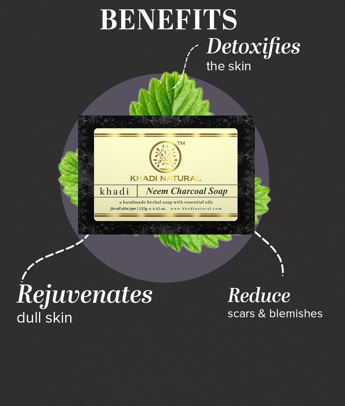 - The Organic Neem Charcoal soap detoxifies deeply, removes impurities, reduces acne, controls oil, and prevents breakouts while keeping the skin smooth, balanced, and refreshed with daily use.