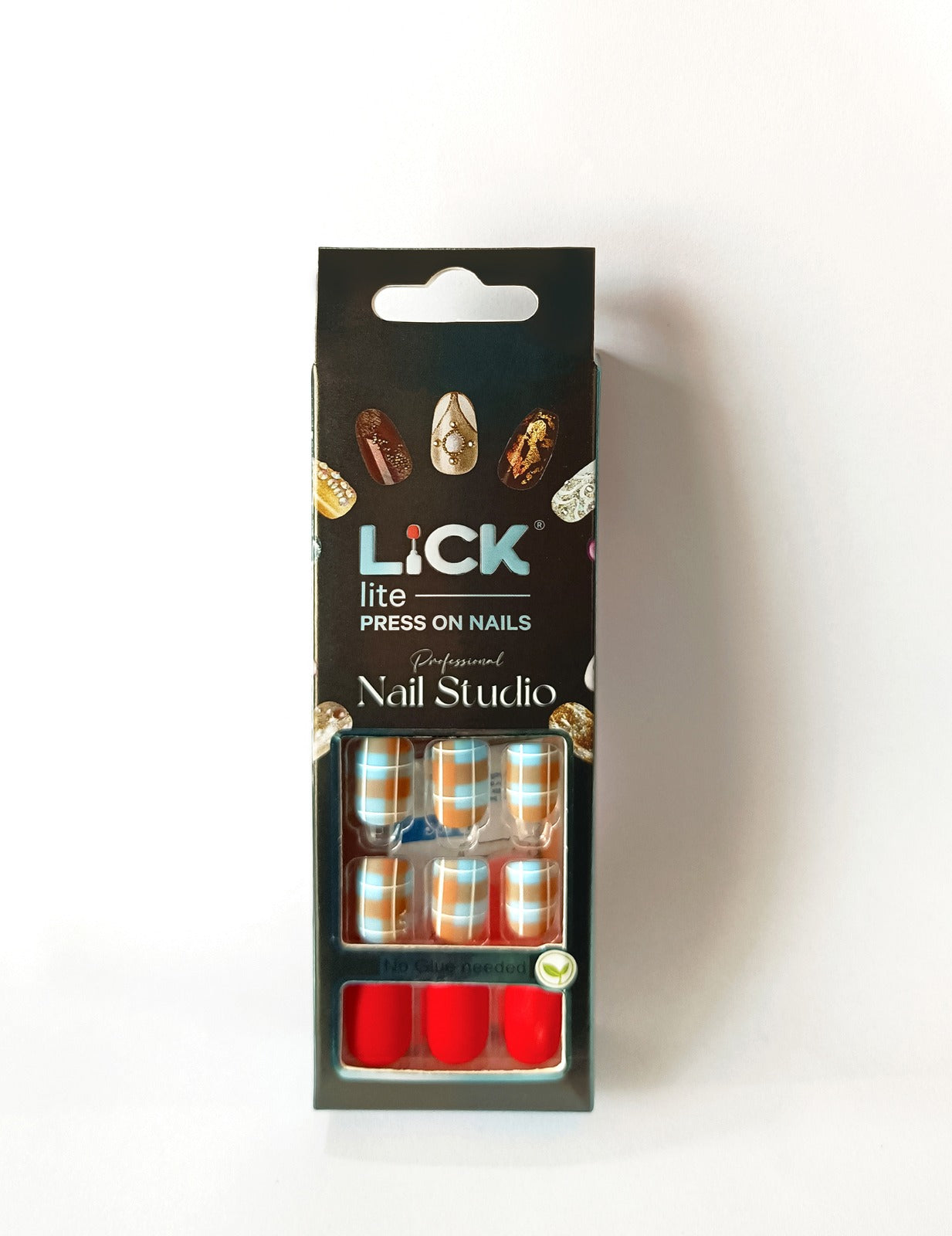 Lick Lite! Stick On Nails | Reusable False/Artificial/Fake Stick on Nails - Checked Turquoise Blue - 30 pcs
