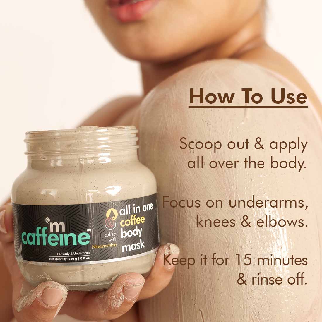 All-in-One Coffee Body Mask infused with skin-friendly ingredients such as Niacinamide, Coffee, Caffeine, Hyaluronic Acid, and Clay. Niacinamide reduces dark spots & pigmentation. It also repairs and conditions the skin. The Coffee & Caffeine duo exfoliates to get rid of tan and dead skin. This energizing duo polishes, tones, and soothes the skin too. Known for its hydrating properties, Hyaluronic Acid plumps the skin and retains moisture.