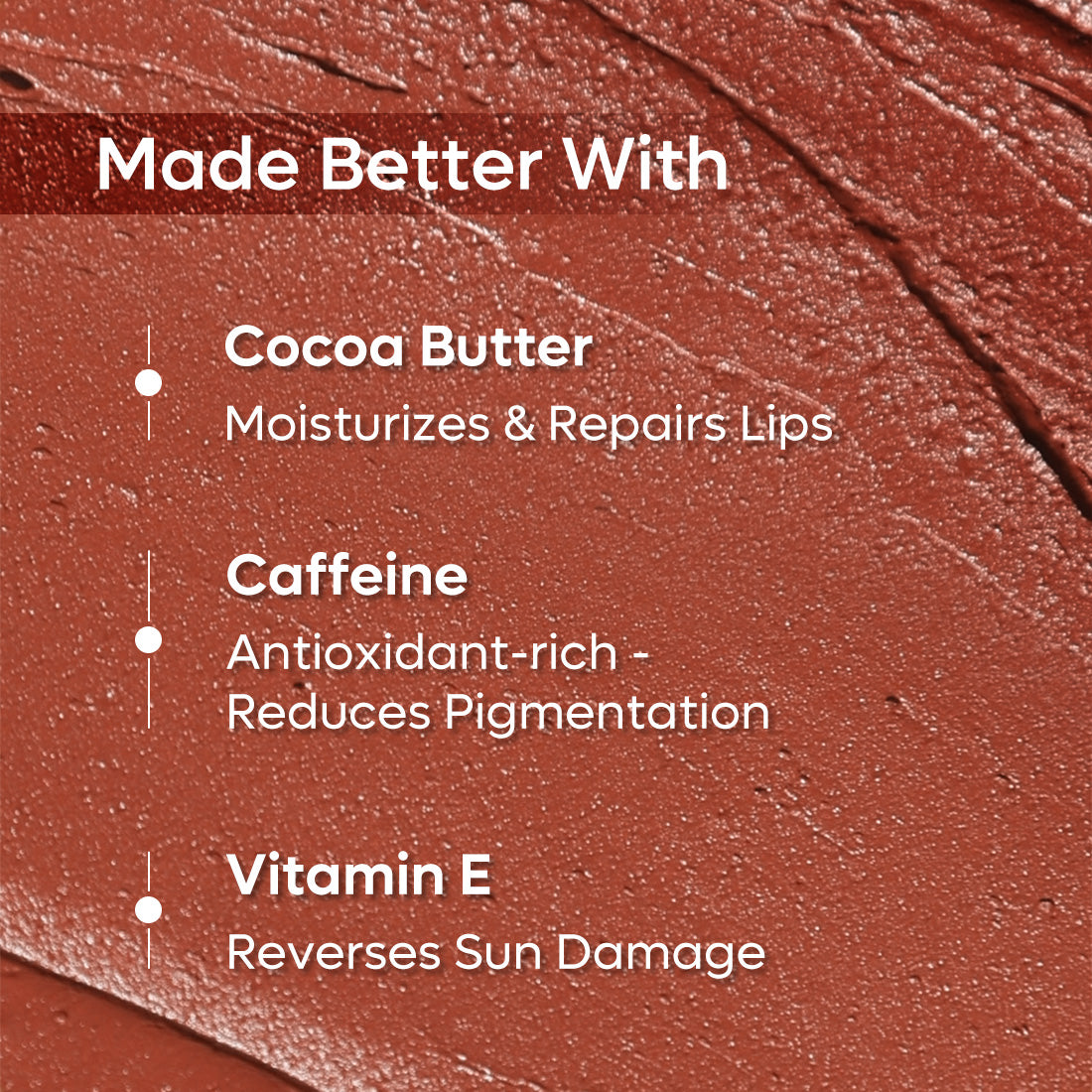 Cocoa Kiss Creamy Matte Lipsticks Moisturizing | Non-Drying | Lightweight | One Swipe Coverage Cover your lips with Cocoa Kiss Creamy Matte Lipsticks, where Nudes are never boring! Would you #DareToIndulge in a lipstick that’s so creamy & weightless, you'll forget you’re wearing one? Introducing, a range of 6 highly pigmented, moisturizing & lightweight lipsticks designed to spread like melted chocolate on your lips while its rich Cocoa aroma makes you want to indulge in it every day! Witness easy, one-stroke application with the blend of Cocoa Butter, Caffeine, and Vitamin E that nourishes, treats dryness reduces lip pigmentation, and protects the skin barrier. Ready to meet your next obsession? Why Should You Buy It? Moisturizing & Non-drying Color that won't fade, moisture that won't budge. Infused with Cocoa Butter, these lipsticks offer an intense color payoff minus the dryness! Weightless Application The feather-light application will make you forget you're even wearing lipstick! It doesn’t crease the lips, ensuring comfortable wear every single time. One Swipe Full Coverage Bid farewell to lipstick struggles with highly pigmented lipstick. It covers the lip contours evenly, leaving you with the perfect pout with just one stroke!