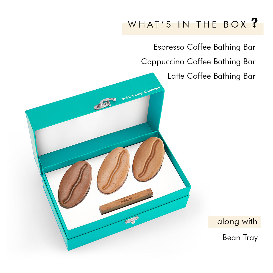 Crafted to elevate the experience of gifting, mCaffeine Coffee Beans - Gift Kit boasts Espresso™ Coffee Bathing Bar, Cappuccino™ Coffee Bathing Bar & Latte™ Coffee Bathing Bar. A great addition to this kit is the Bean Tray, which is made from premium wood, is handcrafted to perfection & is easy to clean.