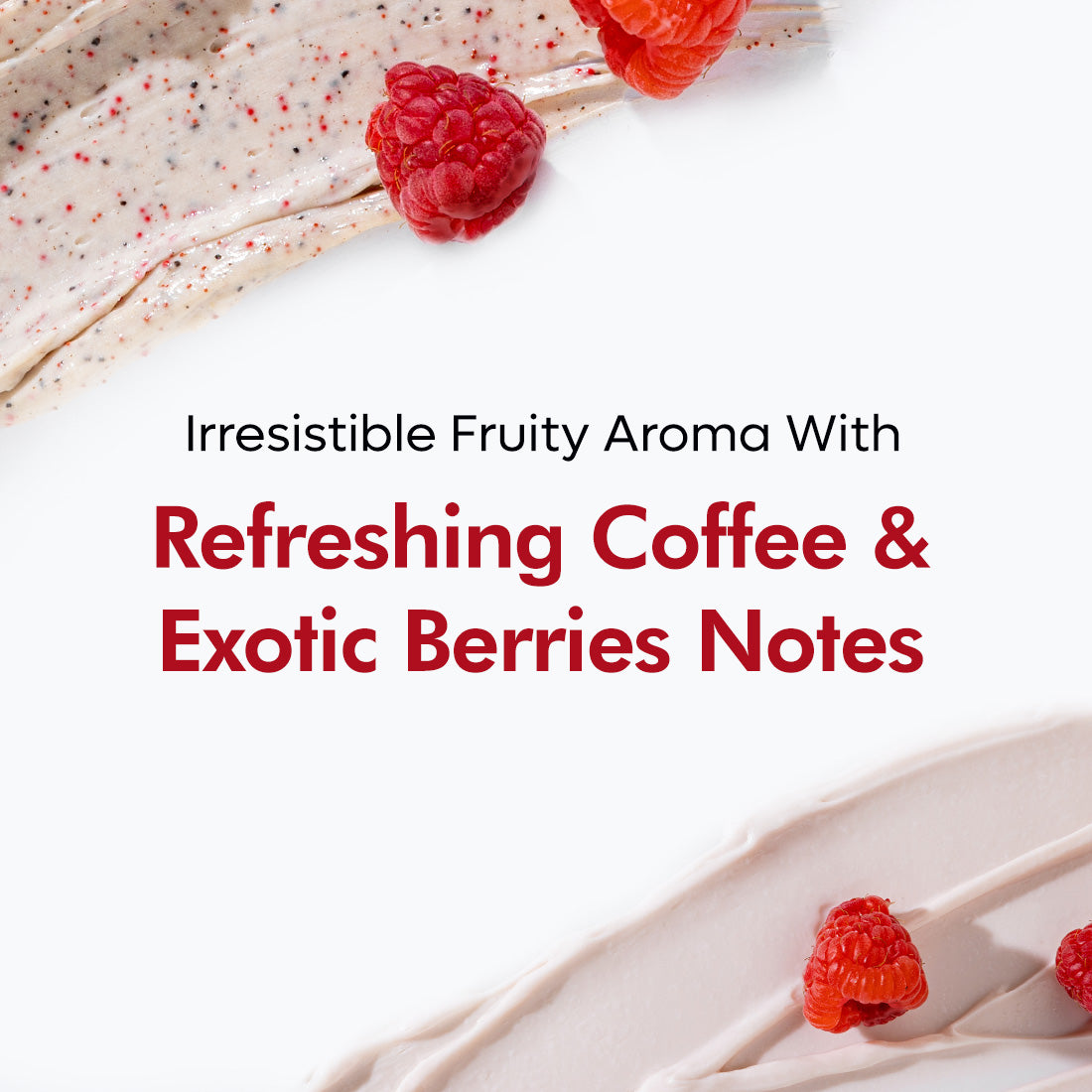 - Coffee Body Scrub with Berries: Pure Arabica Coffee, Arabica Powder, Caffeine, Berries Extract- Raspberry, Cranberry & Strawberry