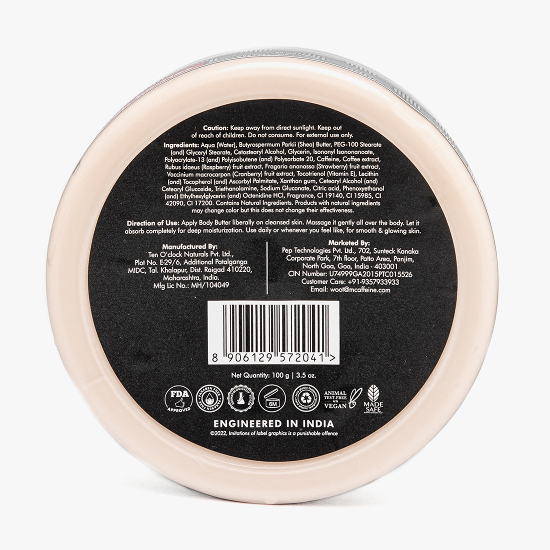 - Coffee Body Butter with Berries: Coffee Extract, Caffeine, Shea Butter, Berries Extract- Raspberry, Cranberry & Strawberry