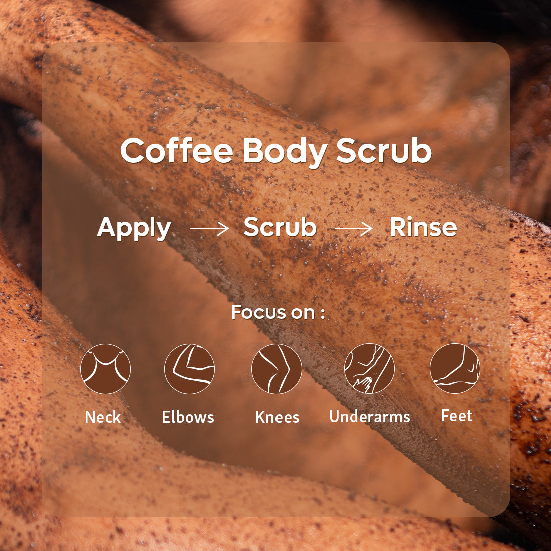 - On the wet body, apply the Coffee Body Scrub and gently scrub in circular motions.