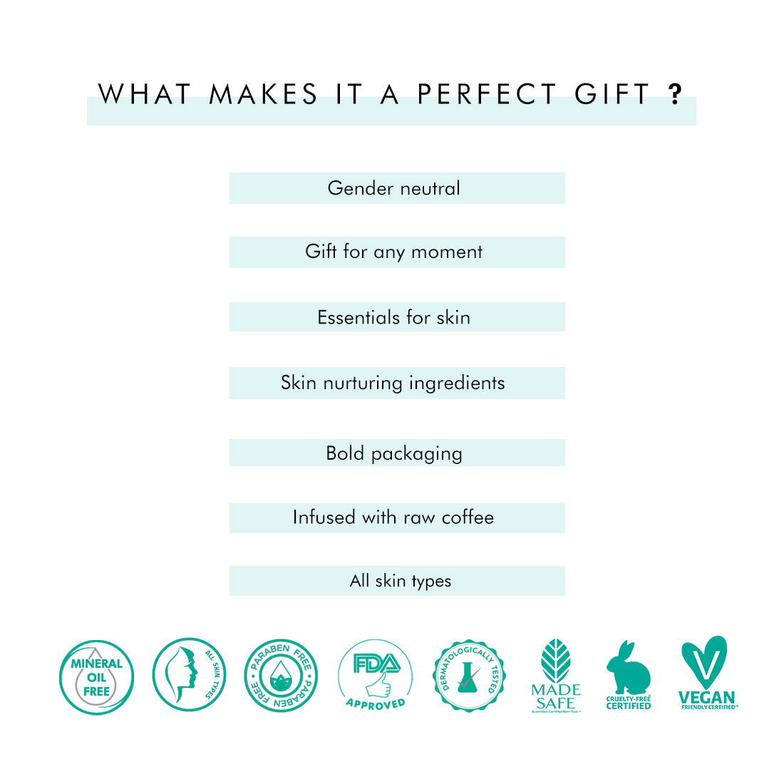 The mCaffeine Coffee Prep - Gift is here to energize & prep the skin for a special day. This Gift Kit is infused with the benefits of Coffee. Pure Arabica Coffee is rich in antioxidants that fight free radicals and keep the skin healthy. It also de-puffs, relieves dark circles, and inflammation. Coffee is a rich source of natural caffeine that tones the skin. The add-on to the benefits is the zesty aroma of freshly grounded Arabica Coffee which elevates the senses.