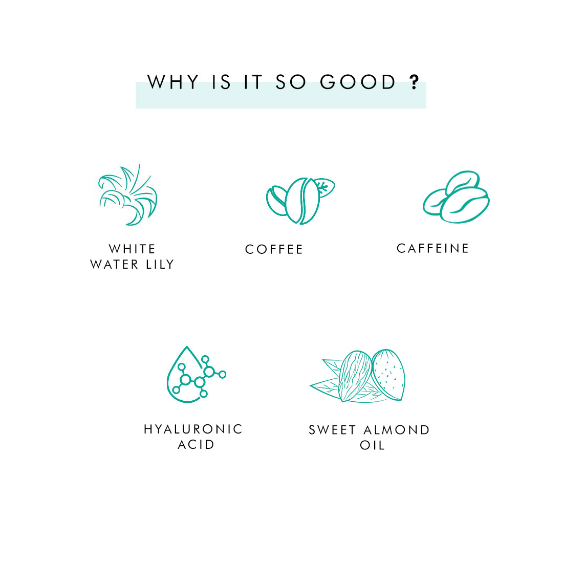 Key Ingredients: Pure Arabica Coffee, Caffeine, White Water Lily, Sweet Almond Oil, Hyaluronic Acid