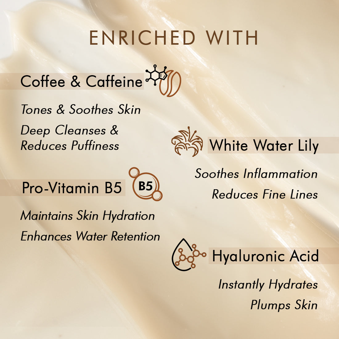Key Ingredients: Coffee & Caffeine, White Water Lily, Pro-Vitamin B5, Hyaluronic Acid