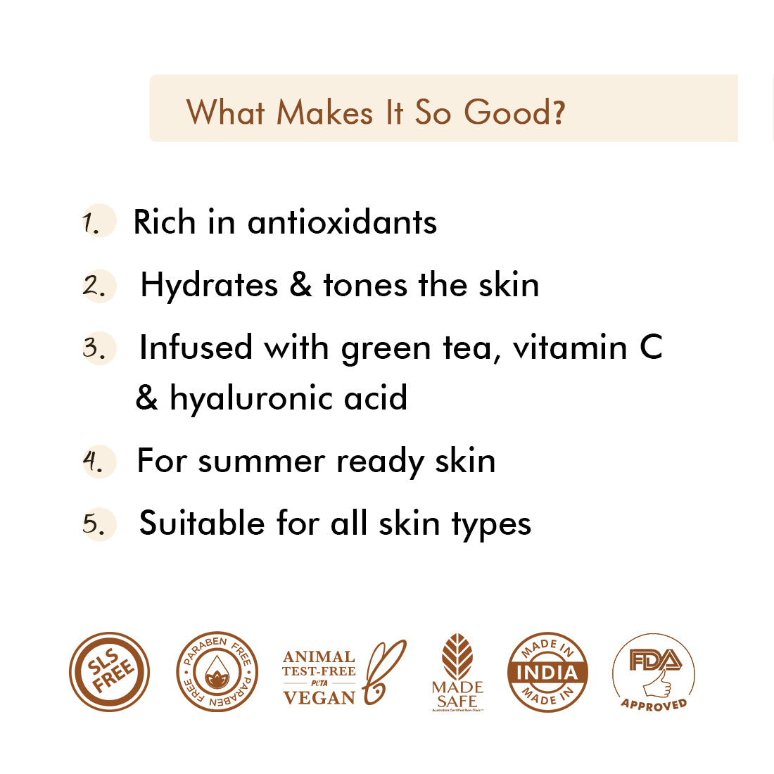 Key Ingredients: Green Tea, Vitamin C, Hyaluronic Acid