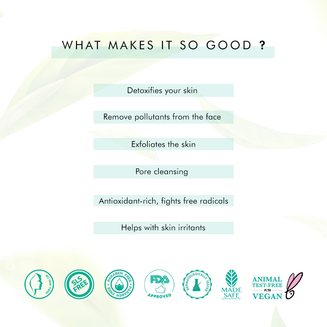 Rich in antioxidants, Green Tea in the face scrub fights against free radicals. Not only this, Green tea has anti-inflammatory properties which makes it an ideal addition to your skincare regime. It also has the superfood for your skin - Caffeine, which tones & soothes the skin and gives a healthy glow. Added are Vitamin C and Hyaluronic Acid which have many benefits for your skin. Vitamin C helps reverse the effects of the harmful rays of the sun. It also relieves skin irritants. Hyaluronic Acid hydrates and conditions the skin.
