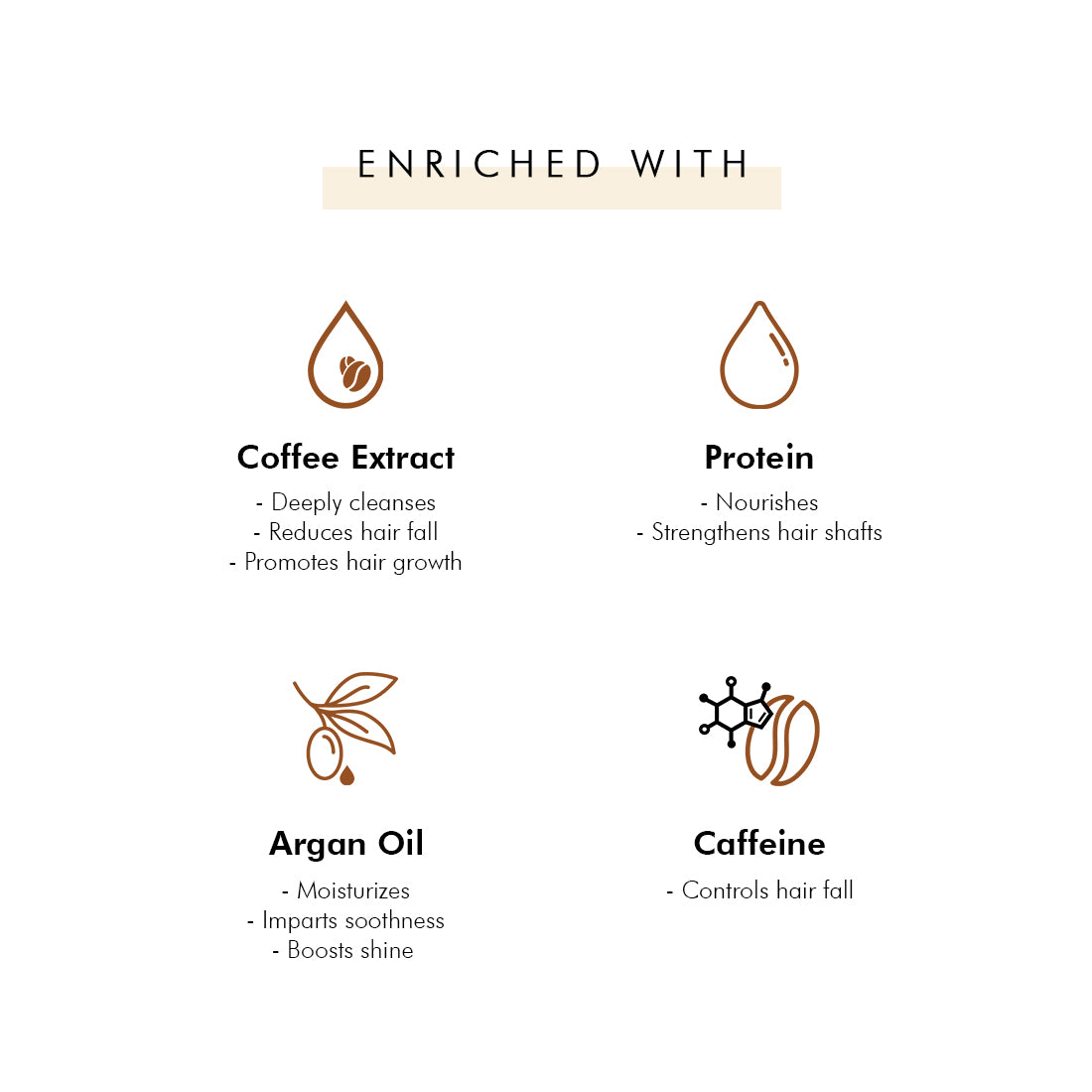 Coffee Shampoo is packed with amazing ingredients such as Coffee, Caffeine, Protein, and Argan Oil. Coffee promotes hair growth. The Caffeine in Coffee helps in hair fall control. The Protein in the shampoo aids in hair shaft nourishment and strengthens the hair shafts. Argan oil moisturizes and takes care of hair smoothness & shine.