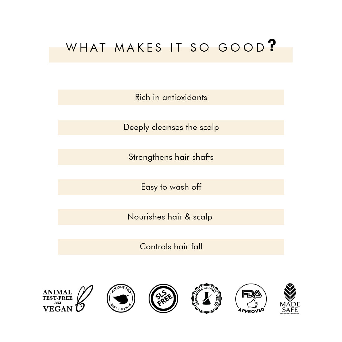 Suitable for all hair types, the Coffee Shampoo is free from Paraben, SLS and Silicone. It is FDA Approved, Dermatologically Tested, Made Safe, Peta Certified Cruelty-Free & 100% Vegan.