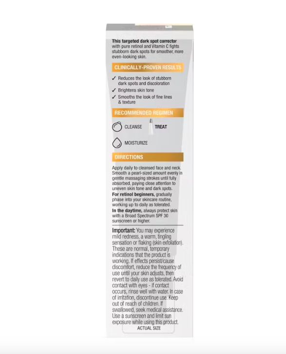 Use this targeted dark spot corrector face serum to help fight stubborn dark spots. Formulated with retinol and vitamin C, this dark spot corrector improves the look of dark spots and skin discoloration, revealing noticeably more even, younger-looking skin in just one week.