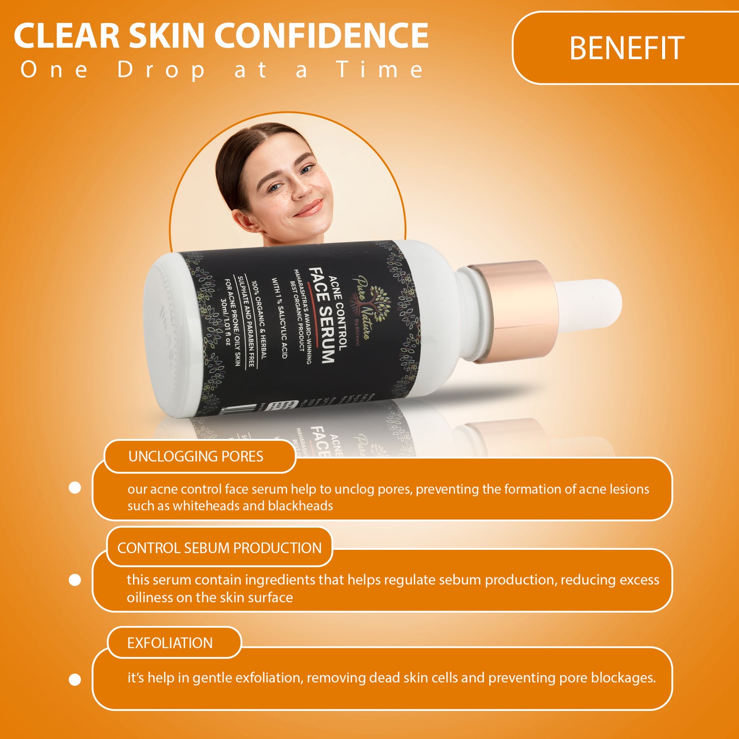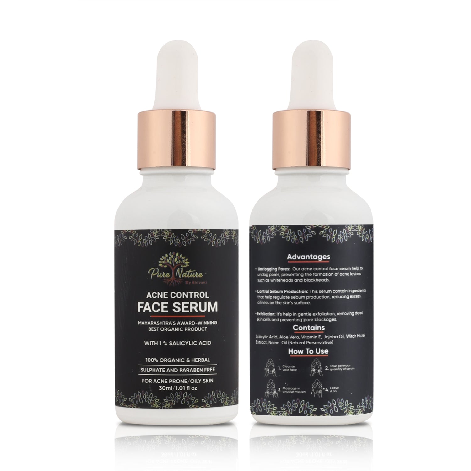 Pure Nature Acne Control Face Serum is a 100% organic and herbal formulation enriched with 1% Salicylic Acid, Vitamin C, Jojoba Oil, and Neem Oil. Designed specifically for oily and acne-prone skin, this serum helps to unclog pores, reduce excess oil, and prevent acne breakouts. Its powerful yet gentle formula works by exfoliating dead skin cells, preventing blackheads and whiteheads, while also controlling sebum production. Vitamin C brightens skin, while Jojoba Oil and Neem Oil provide nourishment and antibacterial protection. Free from sulphates and parabens, this serum leaves your skin clear, smooth, and refreshed.