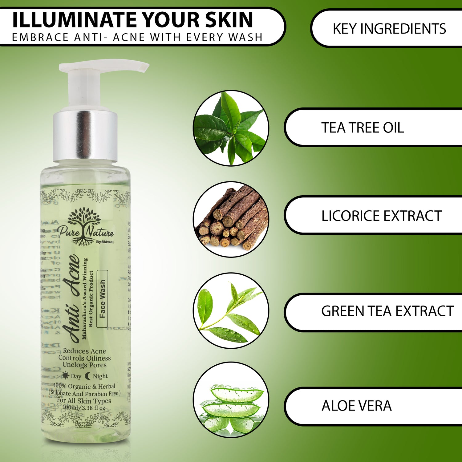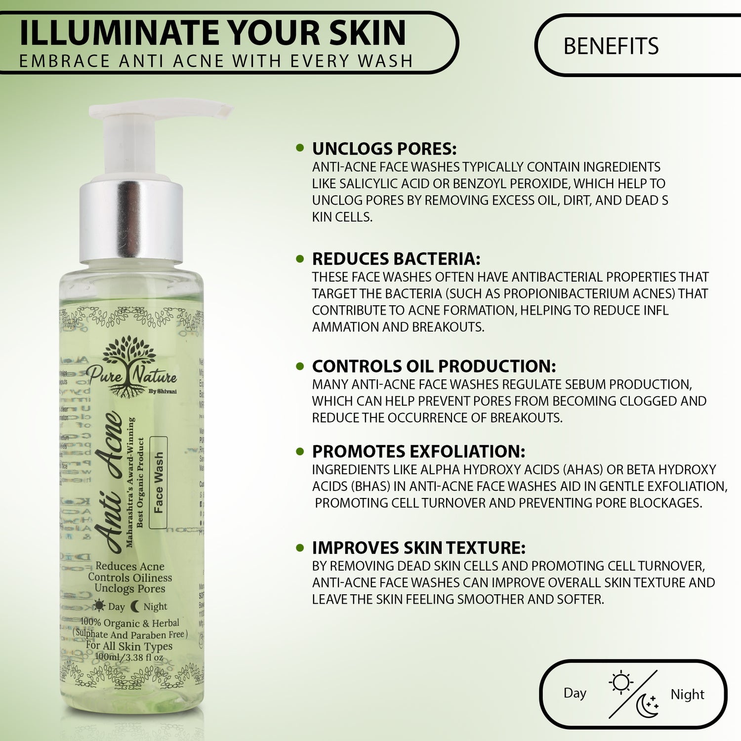 Pure Nature Anti Acne Face Wash is a 100% organic and herbal formula specially designed for acne-prone and oily skin. Enriched with Tea Tree Oil, Licorice Extract, Green Tea Extract, and Aloe Vera, it gently cleanses the skin, unclogs pores, controls excess oil, and helps reduce acne-causing bacteria. This sulphate-free and paraben-free cleanser not only prevents breakouts but also promotes exfoliation, improves skin texture, and soothes irritation, leaving the skin smoother and clearer with every wash. Safe for daily use, it is suitable for all skin types, especially acne-prone skin, and can be used both day and night.