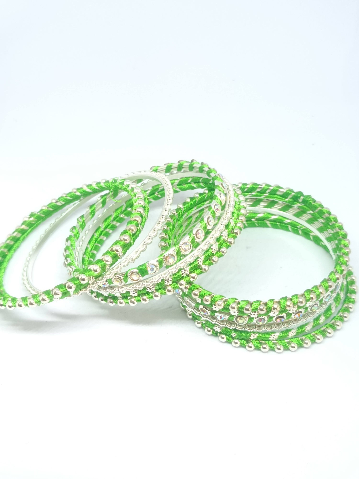Add a touch of elegance and tradition to your look with this stunning Silk Thread Kundan Studded Bangle Set. Carefully handcrafted, these bangles are wrapped in premium silk thread and beautifully embellished with shimmering kundan work and sparkling stones.