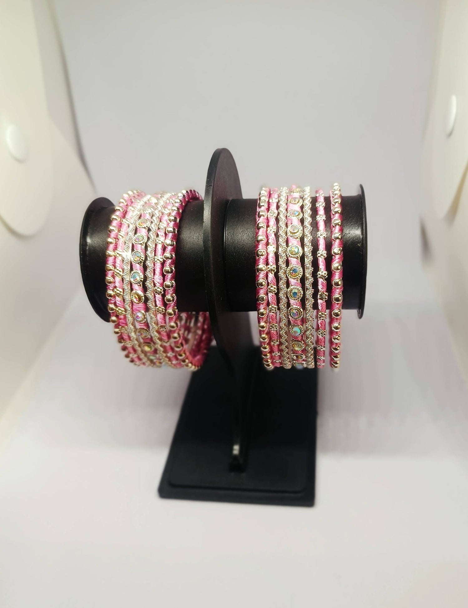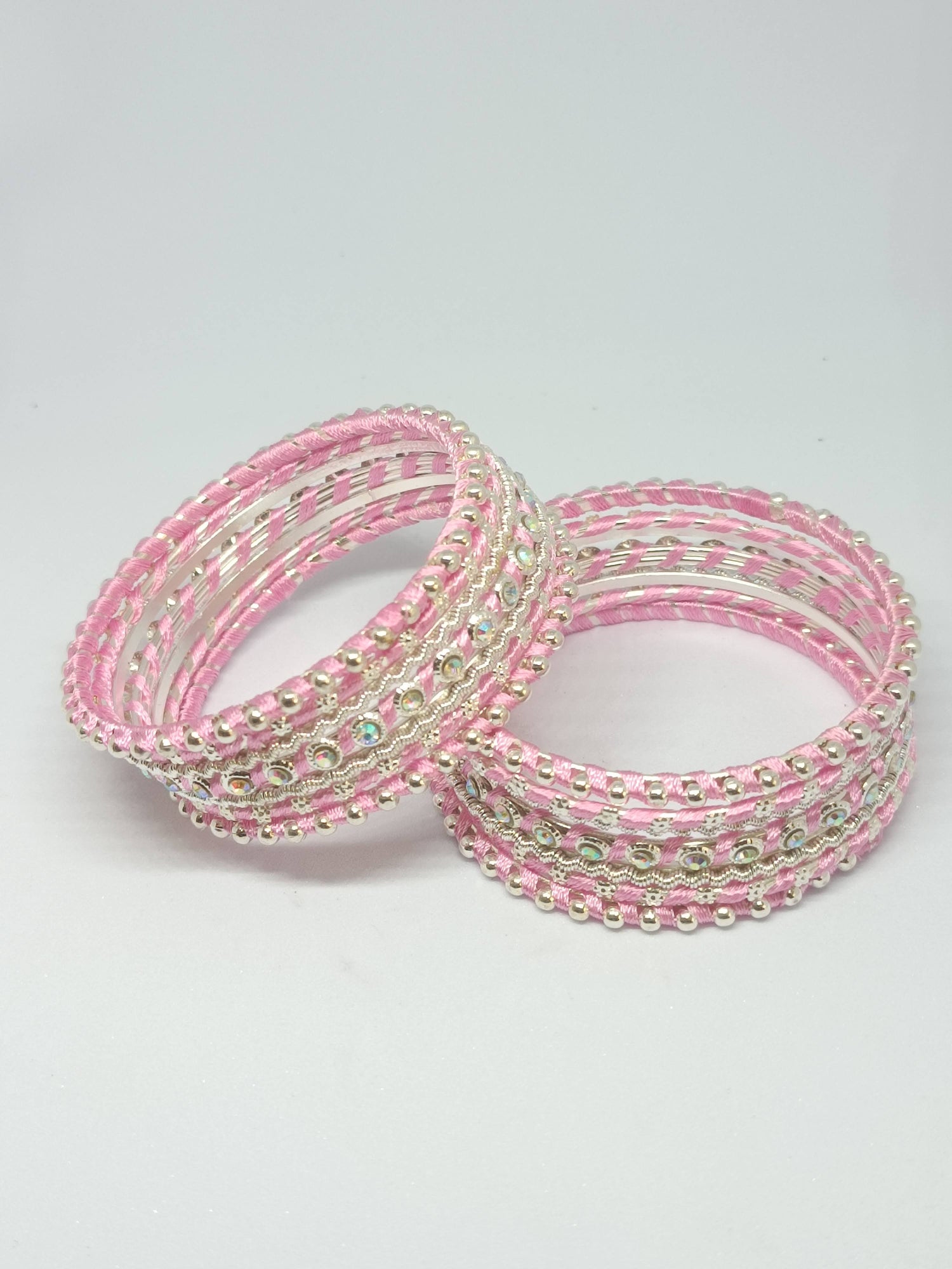 Set of 14 Silk Thread, Stone & Kundan Studded Chuda Bangles | Ethnic Collection | Gift for Women - Baby Pink with Silver