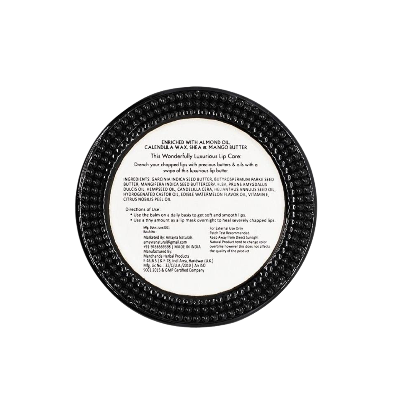 Ingredients: BUTYROSPERMUM PARKII BUTTER, Garcinia Indica Seed Butter, MANGIFERA INDICA SEED BUTTER, Prunus Amygdalus Dulcis Oil, Hempseed Oil, Euphorbia Cerifera wax, Helianthus annuus Oil, Hydrogenated Castor Oil, Citrullus lanatus Seed Oil, Edible Citrullus lanatus Flavor, Tocopherol Acetate, Citrus Reticulata Peel Oil